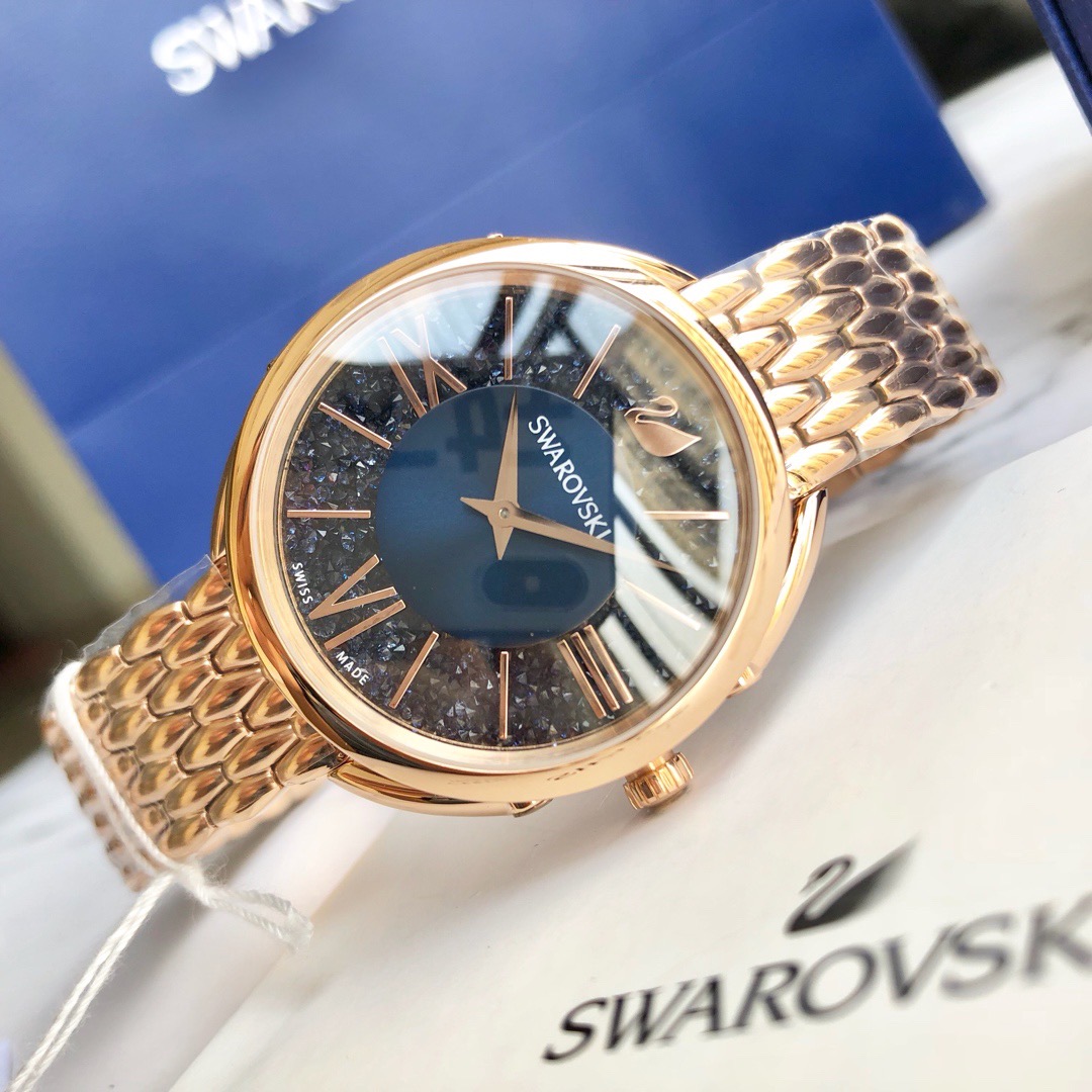 施华洛世奇小天鹅Crystalline Glam 系列,精致优雅的黑色图纹表盘上镶有800多颗璀璨迷人的灰色水晶,搭配玫瑰金罗马数字刻度以及不锈钢金属表链,适合日常装扮增添闪亮魅力的时尚女性;