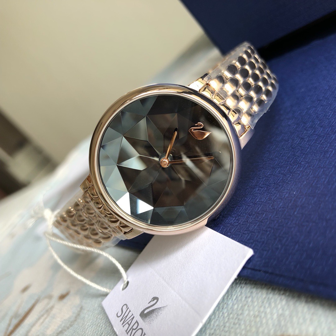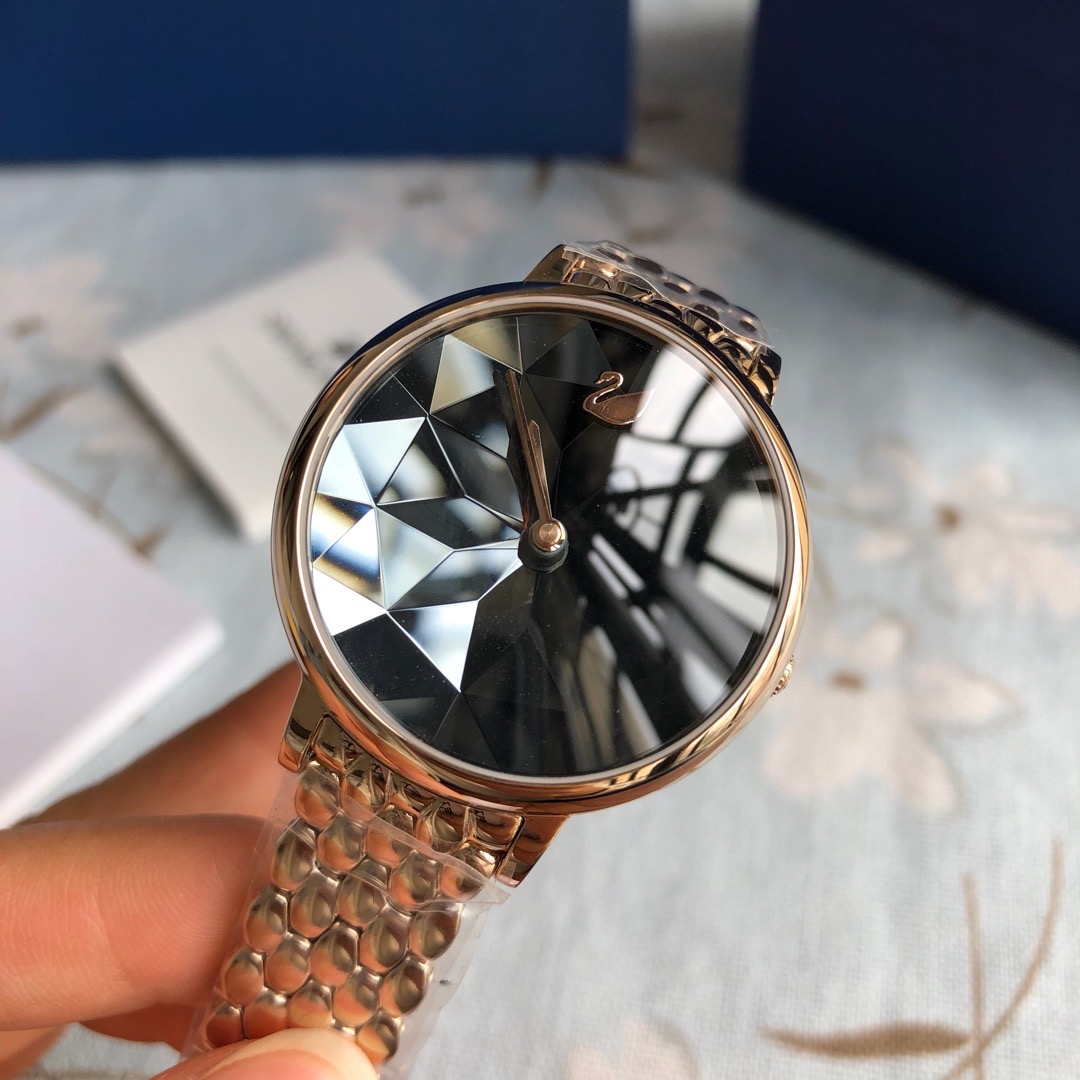 施华洛世奇小天鹅Crystal Lake系列,表盘是由一整件闪亮迷人的Swarovski蓝宝石水晶,采用钻石切割工艺制成八心八箭团,别树一格,适合日常装扮增添闪亮魅力的时尚女性;