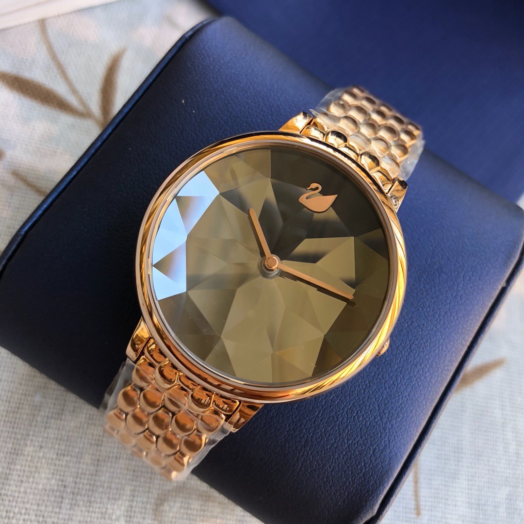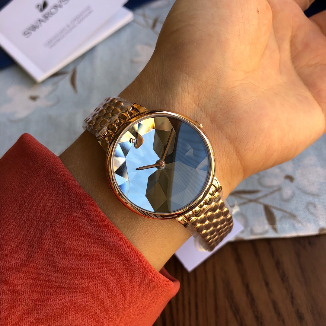 施华洛世奇小天鹅Crystal Lake系列,表盘是由一整件闪亮迷人的Swarovski蓝宝石水晶,采用钻石切割工艺制成八心八箭团,别树一格,适合日常装扮增添闪亮魅力的时尚女性;