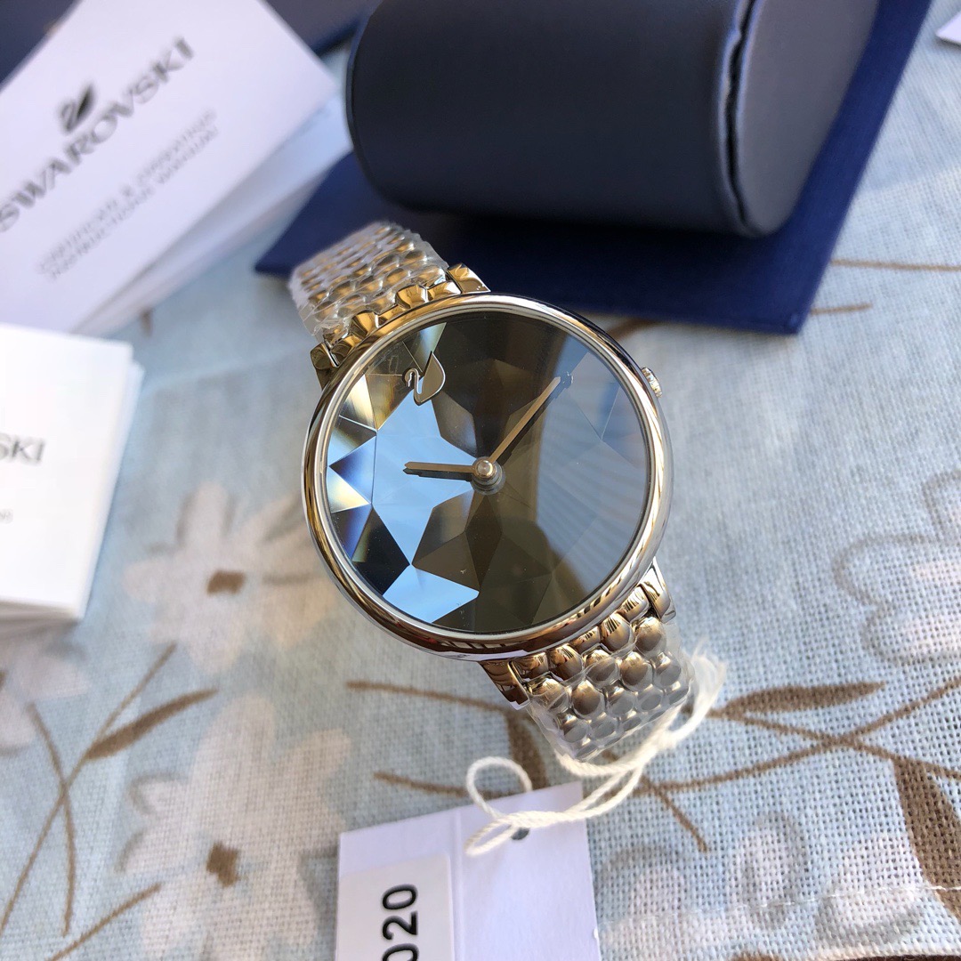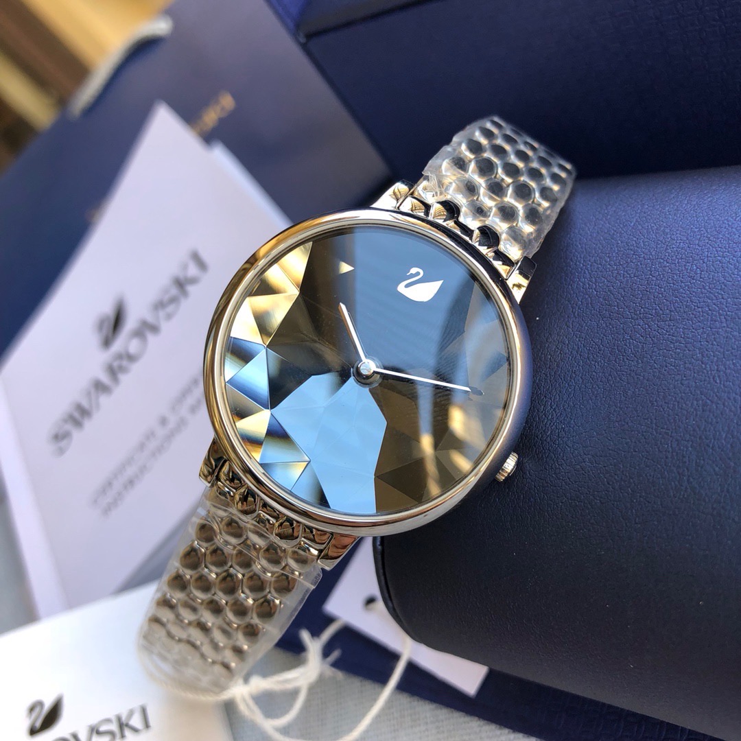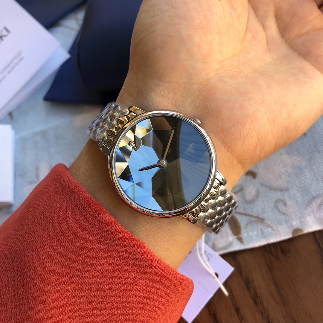 施华洛世奇小天鹅Crystal Lake系列,表盘是由一整件闪亮迷人的Swarovski蓝宝石水晶,采用钻石切割工艺制成八心八箭团,别树一格,适合日常装扮增添闪亮魅力的时尚女性;
