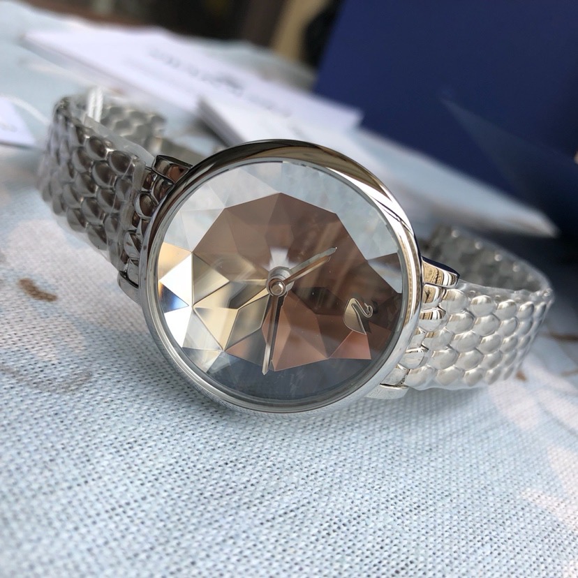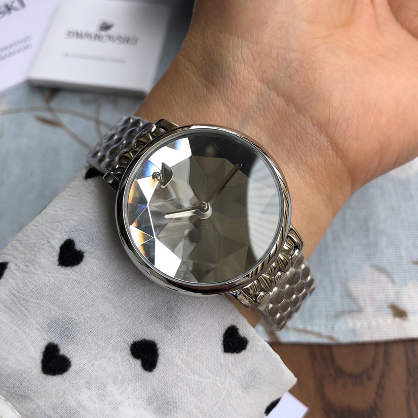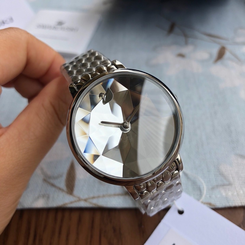 施华洛世奇小天鹅Crystal Lake系列,表盘是由一整件闪亮迷人的Swarovski蓝宝石水晶,采用钻石切割工艺制成八心八箭团,别树一格,适合日常装扮增添闪亮魅力的时尚女性;
