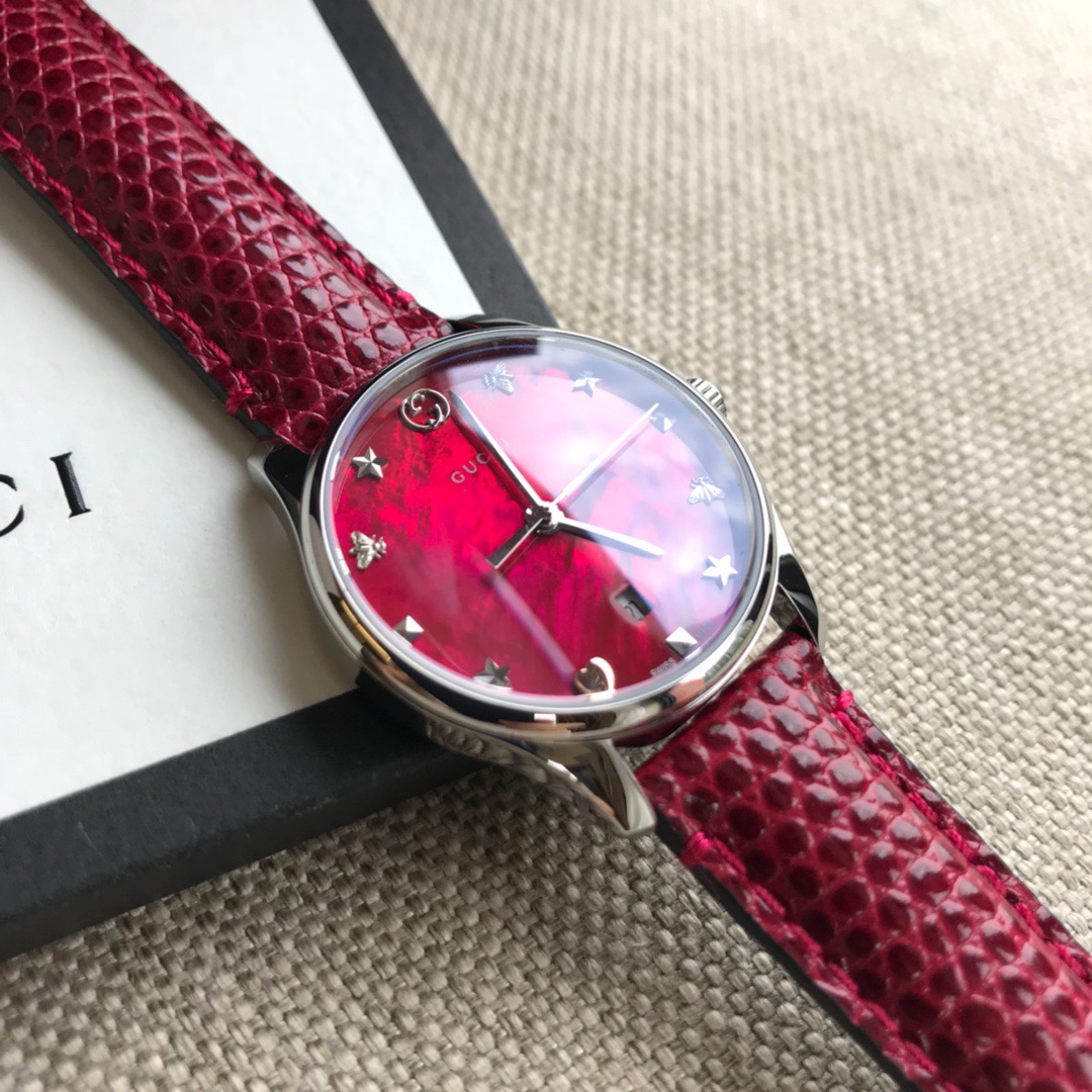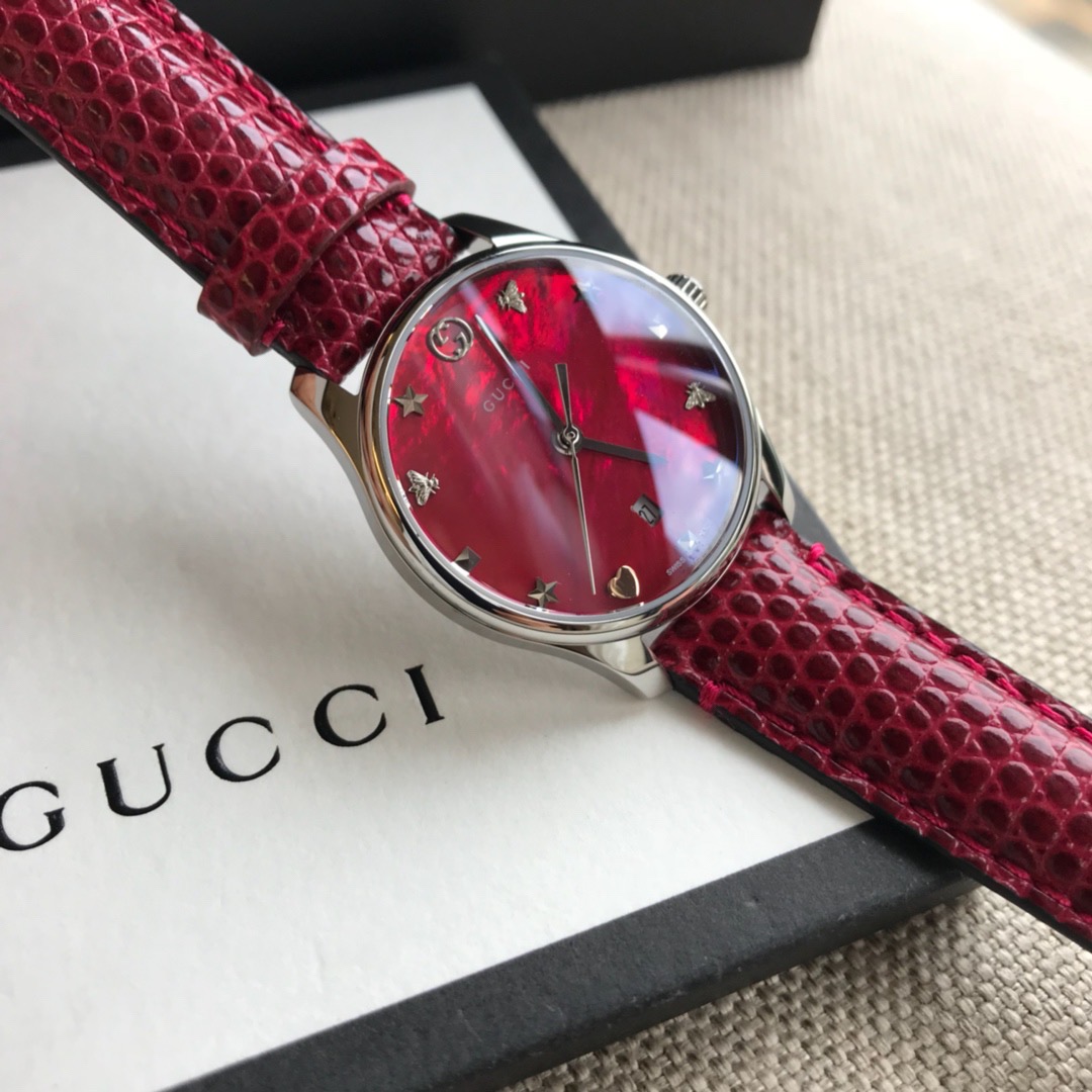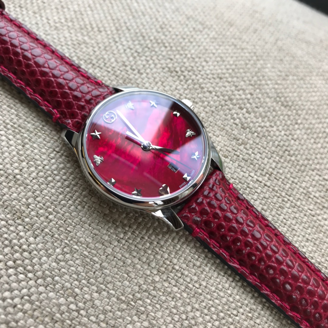 GUCCI 专柜最新小蜜蜂石英女表,搭配interlocking G表冠,天然贝母的表盘,配以蜜蜂雕花,蜥蜴皮表带配以不锈钢针式带扣;