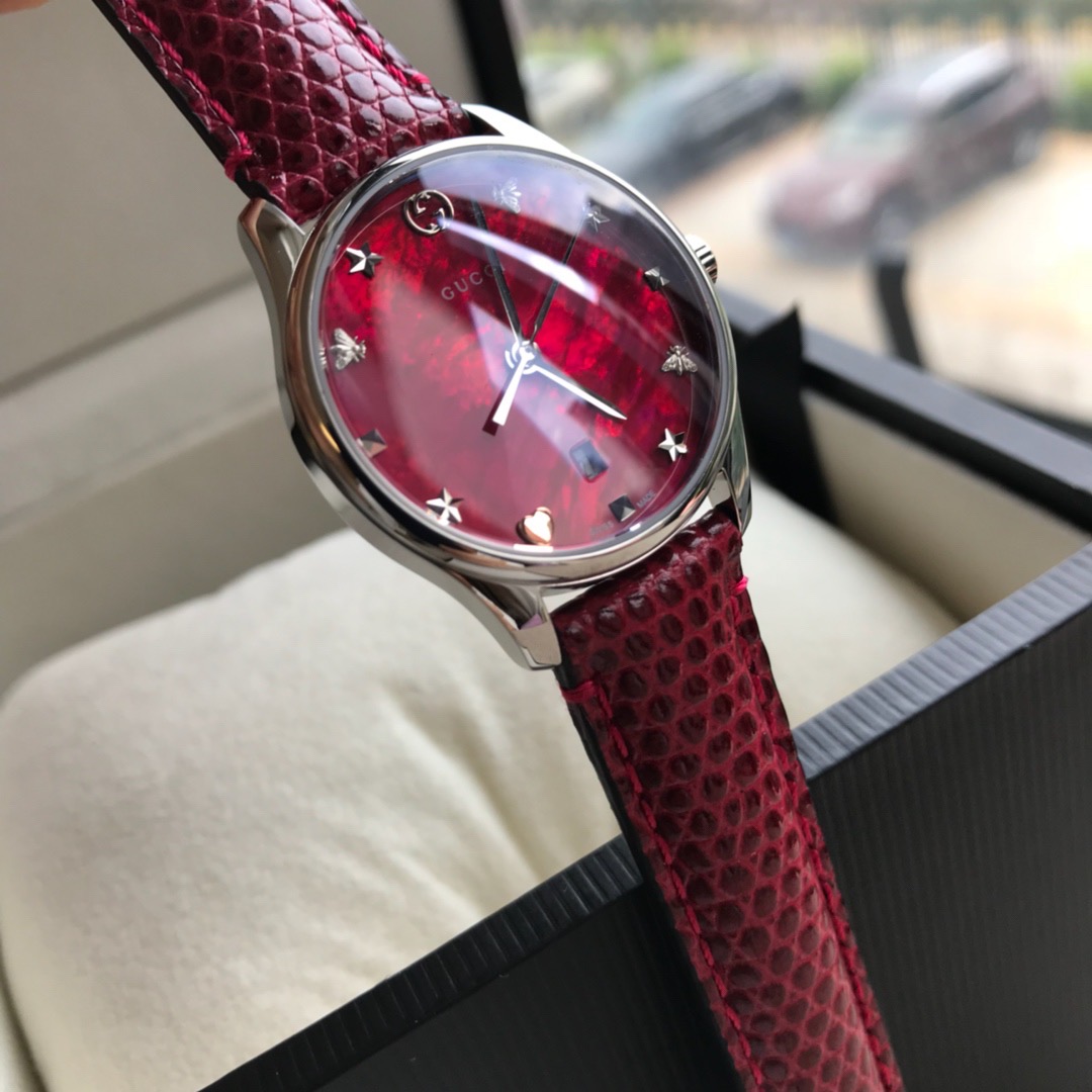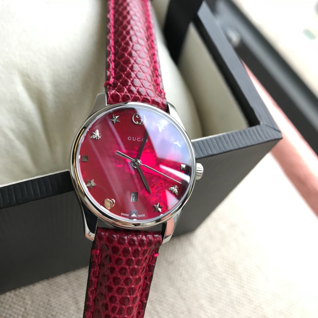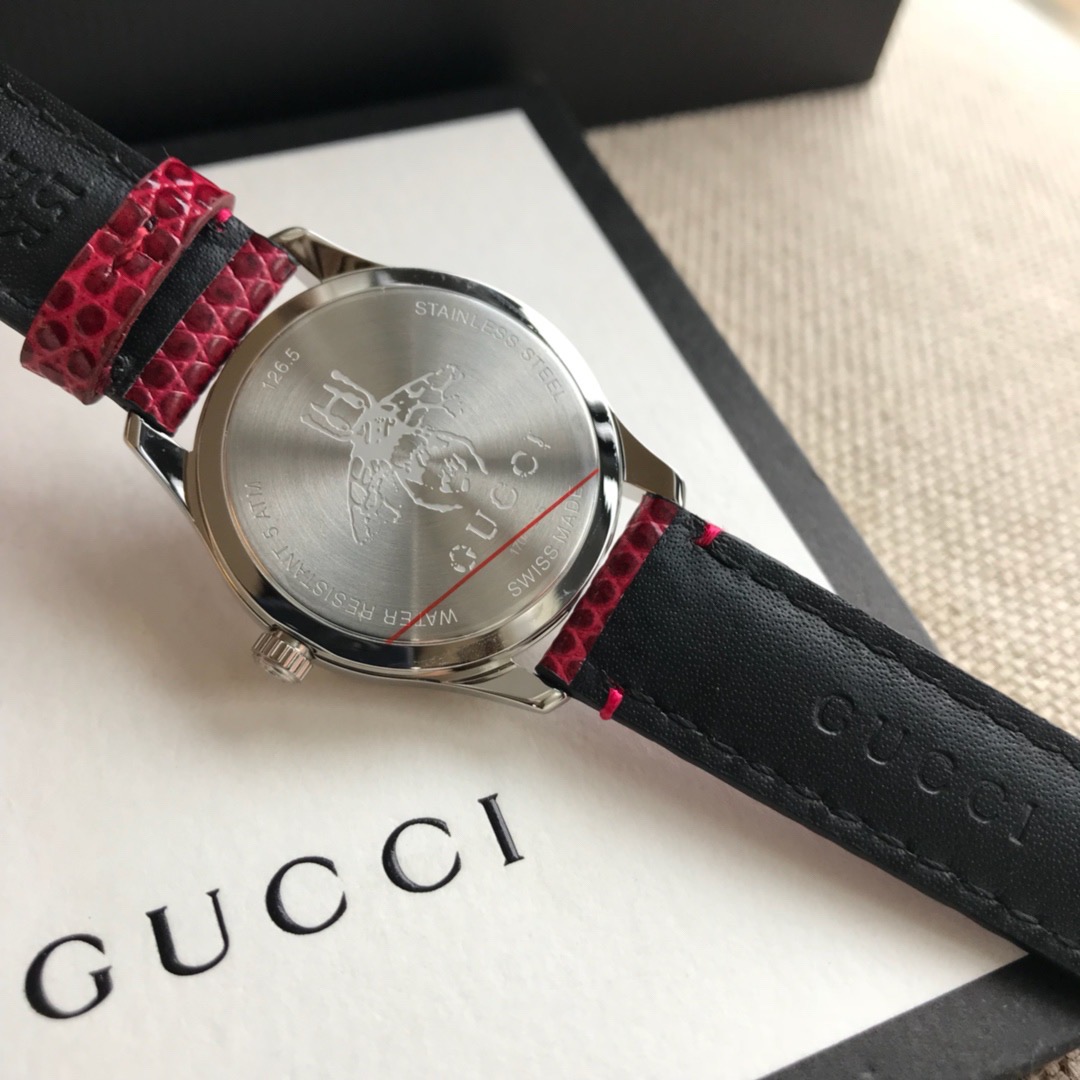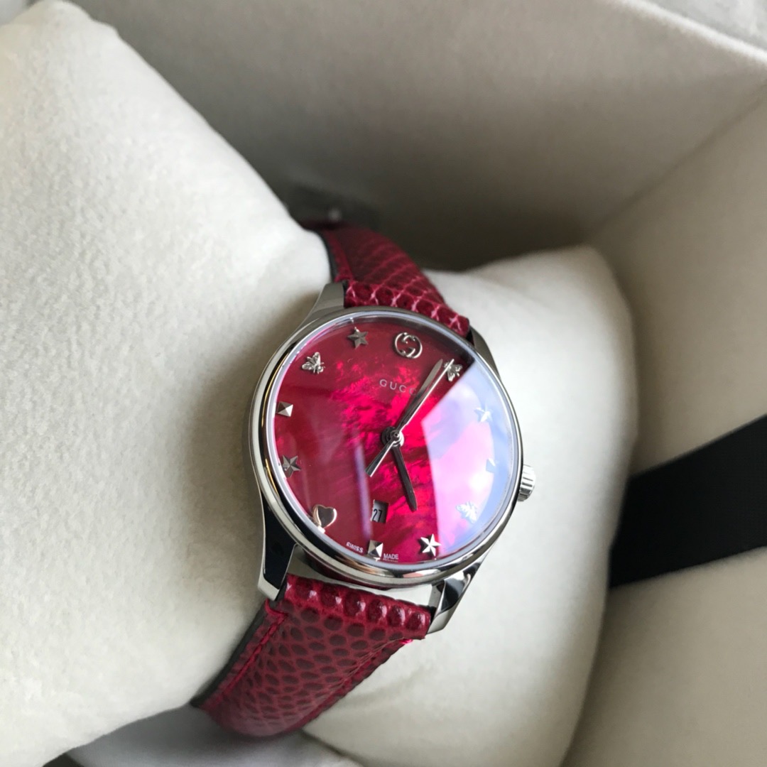 GUCCI 专柜最新小蜜蜂石英女表,搭配interlocking G表冠,天然贝母的表盘,配以蜜蜂雕花,蜥蜴皮表带配以不锈钢针式带扣;