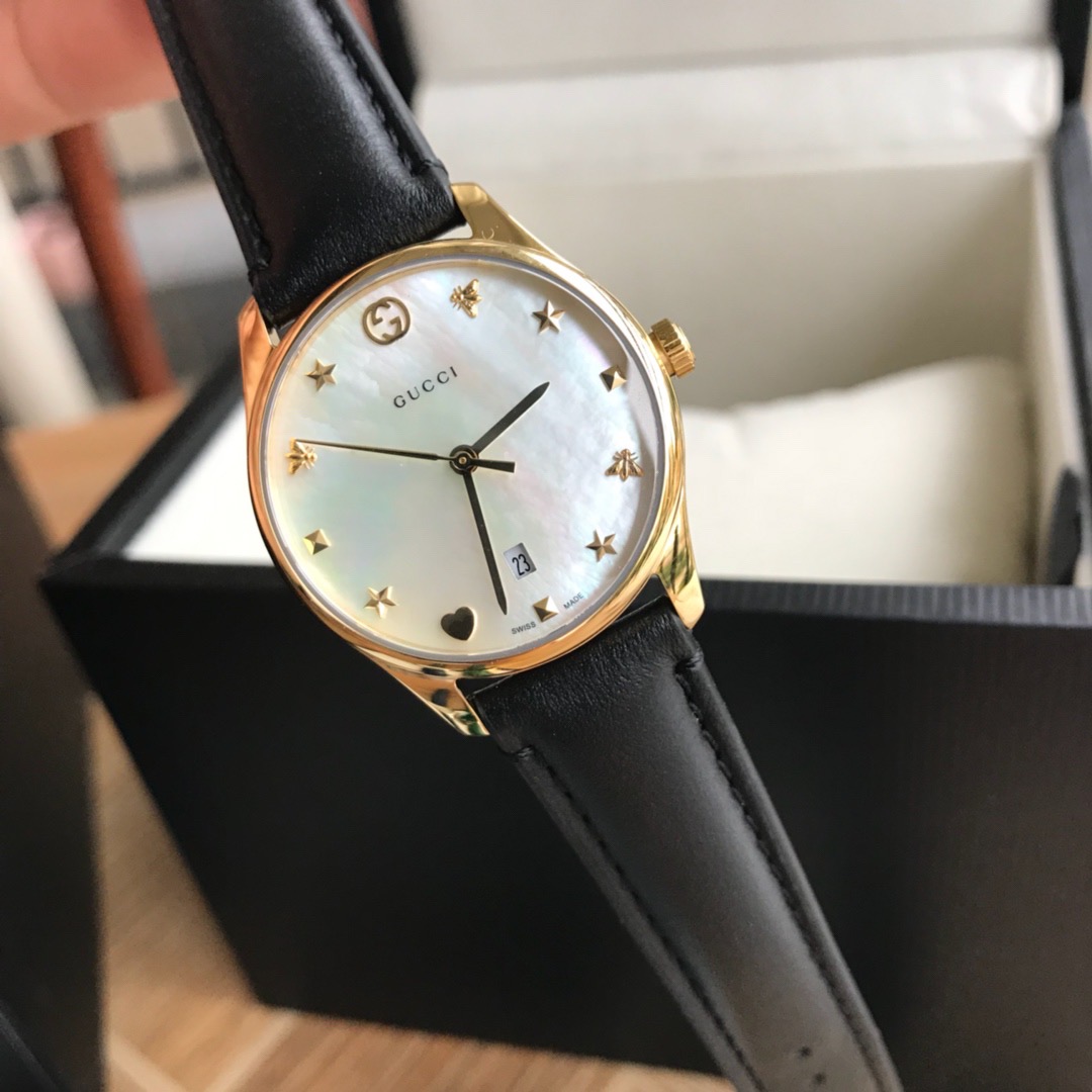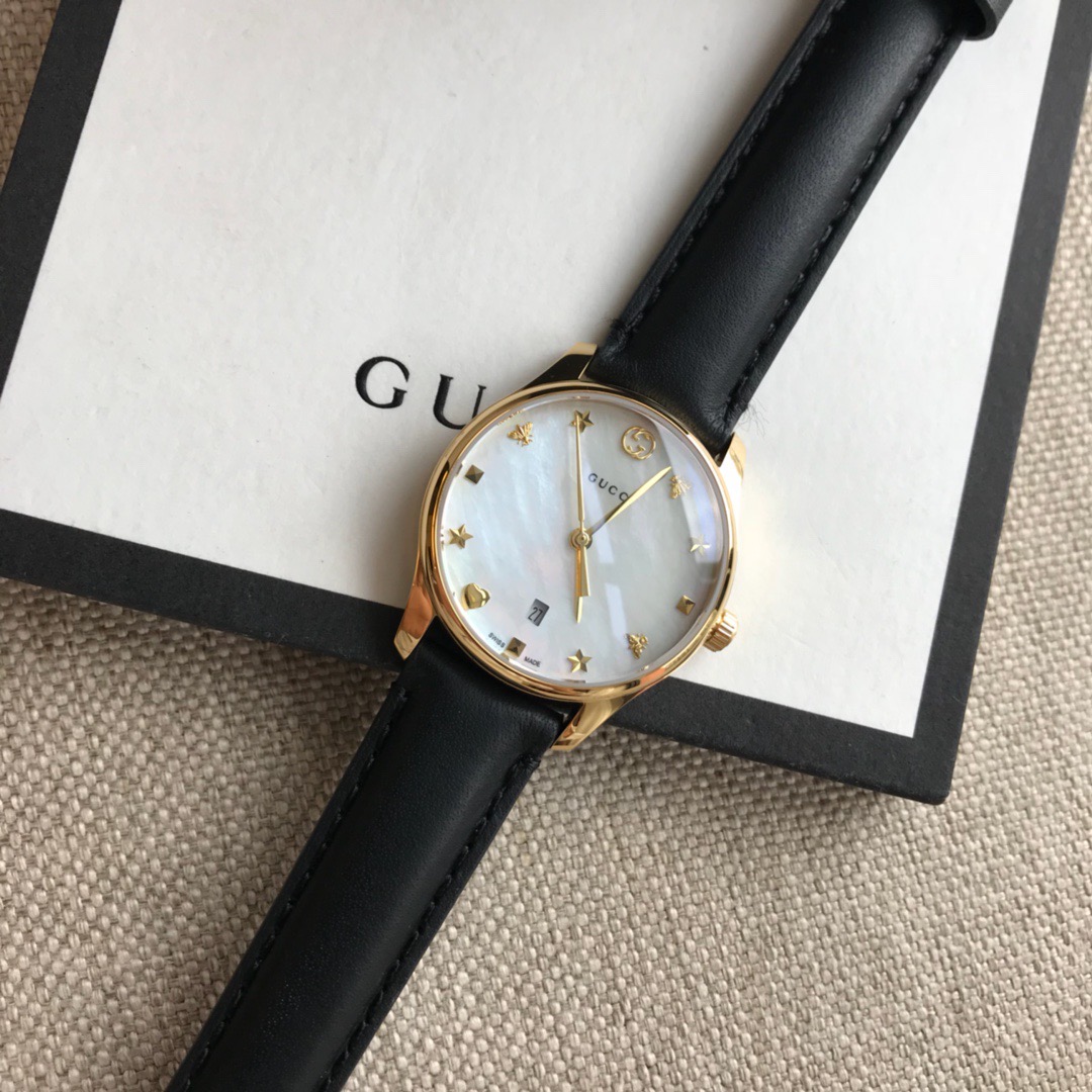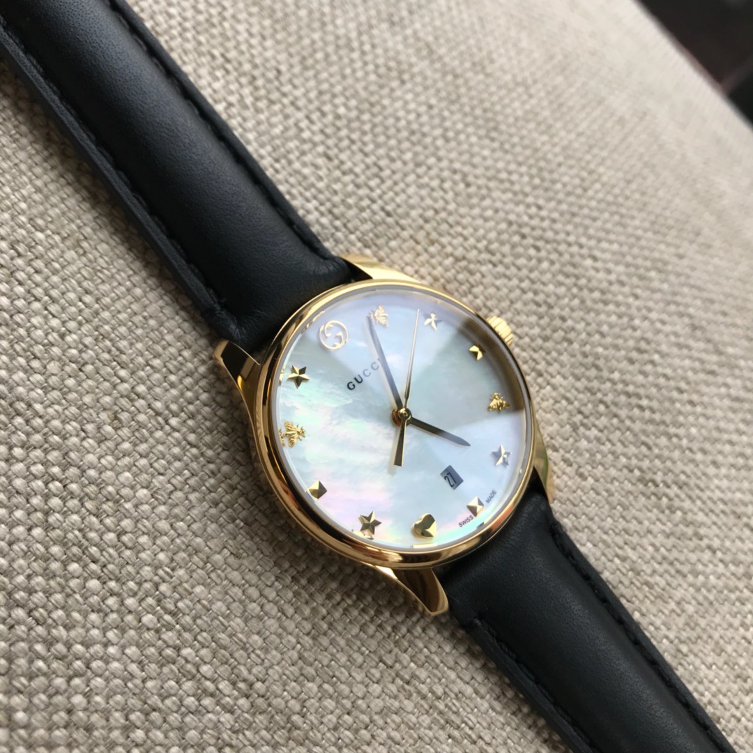 GUCCI 专柜最新小蜜蜂石英女表,搭配interlocking G表冠,天然贝母的表盘,配以蜜蜂雕花,蜥蜴皮表带配以不锈钢针式带扣;