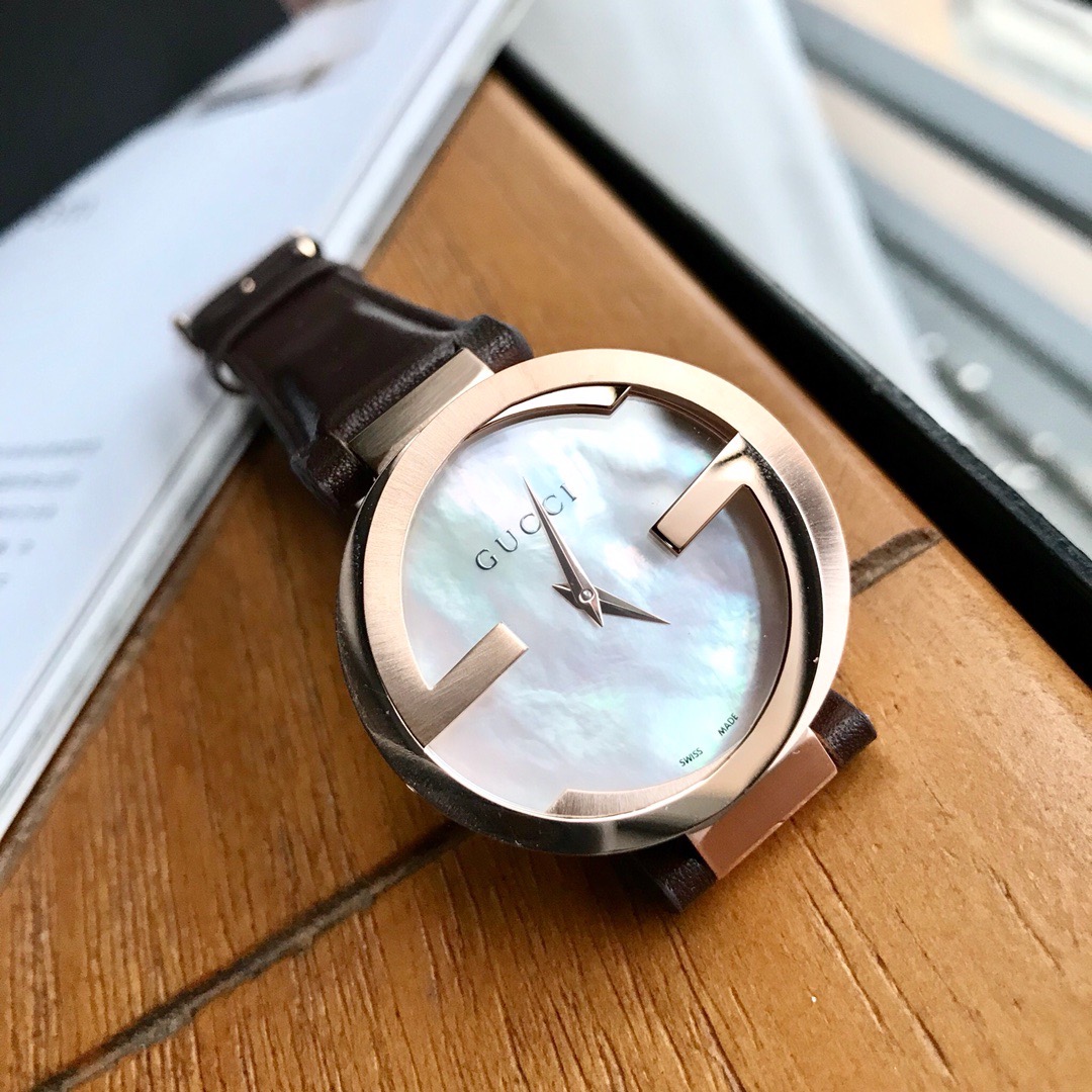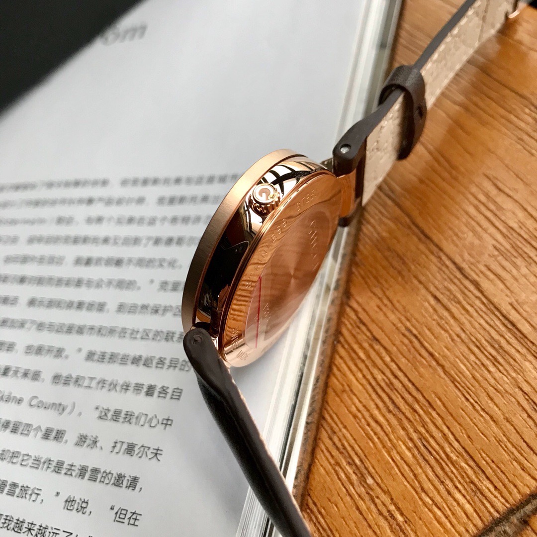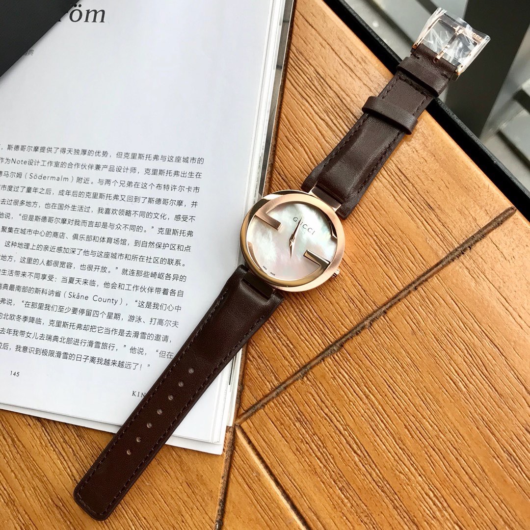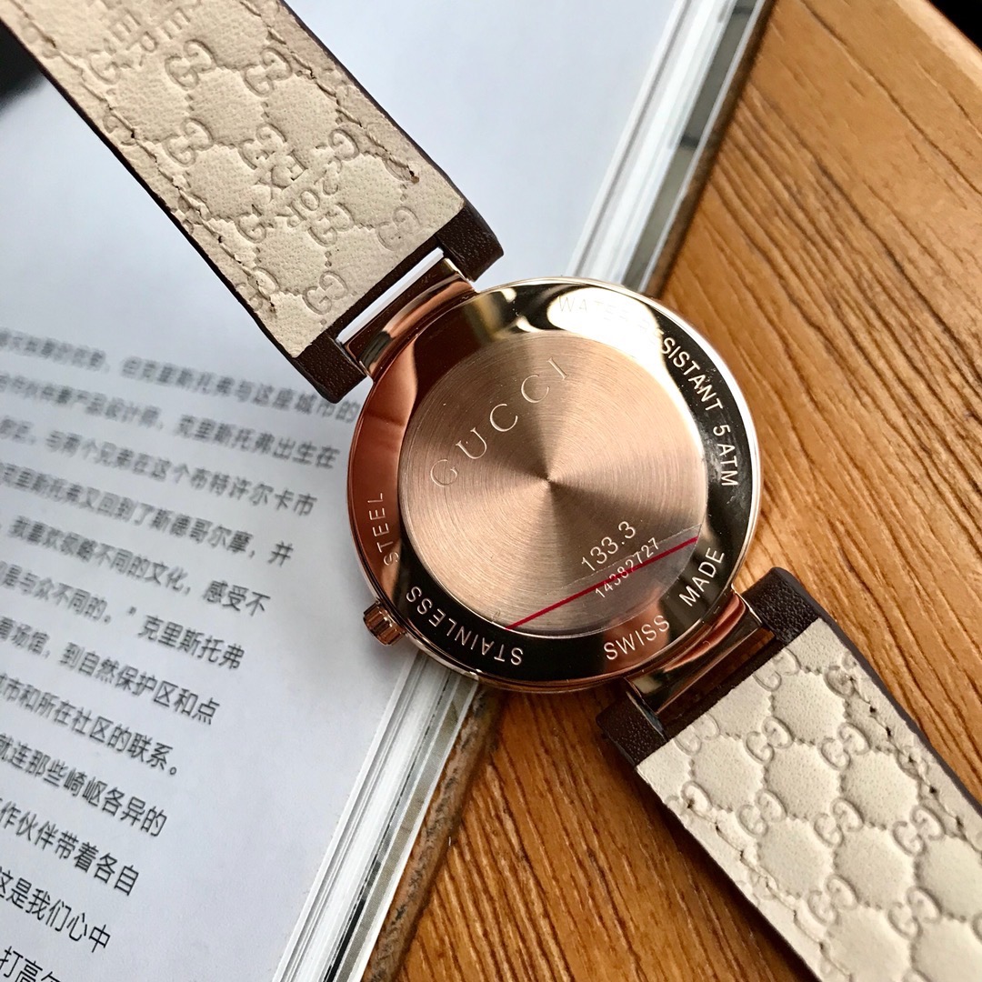 Gucci 小牛皮款双G款,适合所有妹子的37毫米表径,玫瑰金电镀表壳,防刮花蓝宝石玻璃镜面,市面上有很多low的版本都是用的普通玻璃;