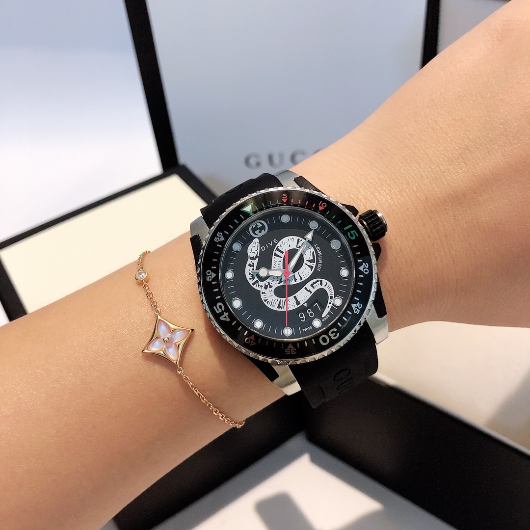 GUCCI古驰 Dive腕表,中性休闲风格的浮凸个性G家标识,橡胶表带搭配品牌代表性设计元素,框于PVD镀层表壳中;