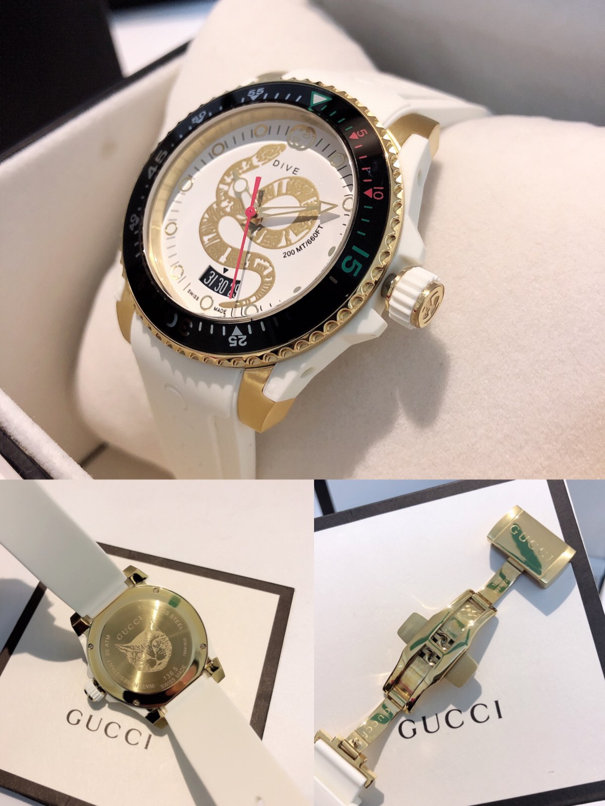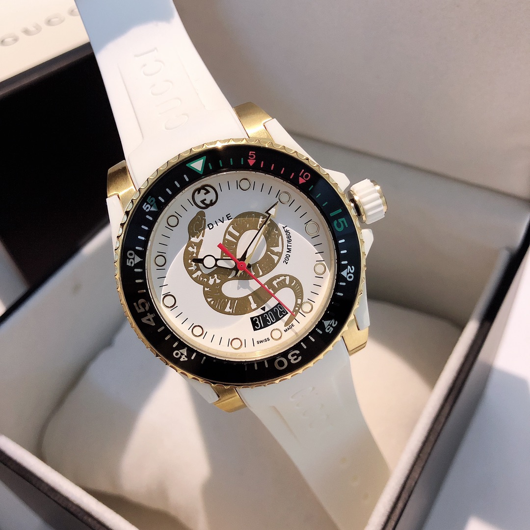 GUCCI古驰 Dive腕表,中性休闲风格的浮凸个性G家标识,橡胶表带搭配品牌代表性设计元素,框于PVD镀层表壳中;