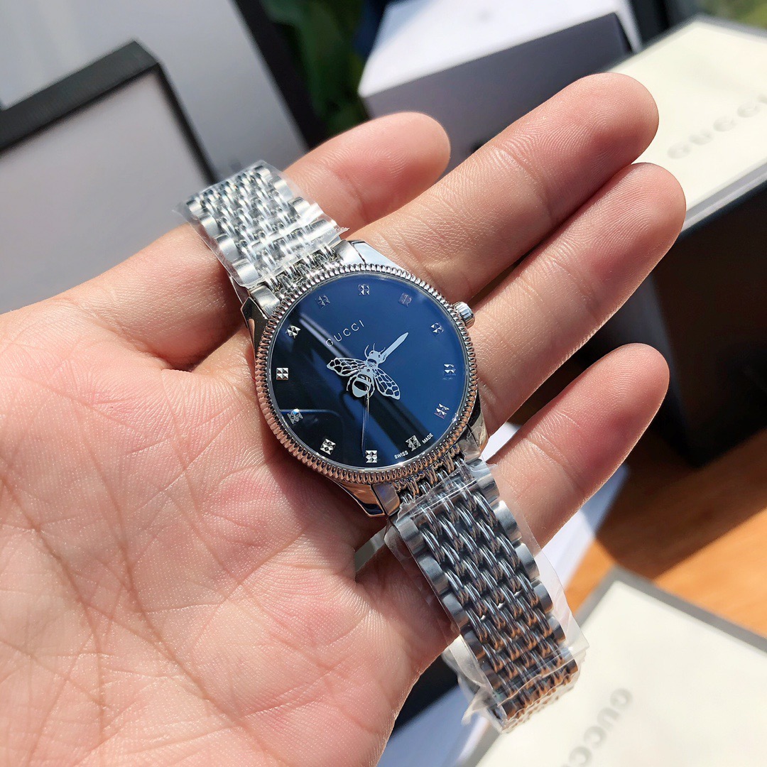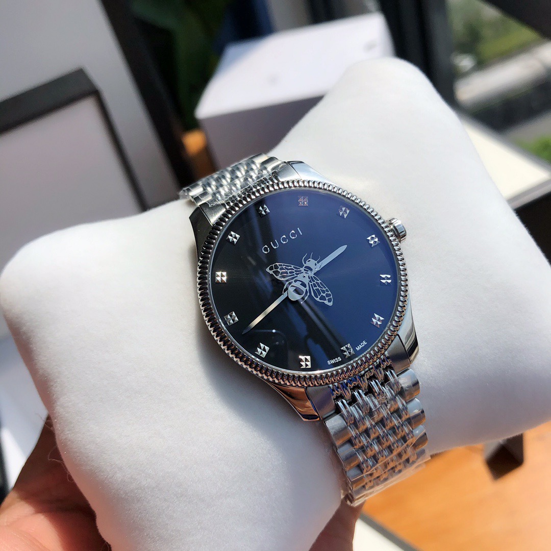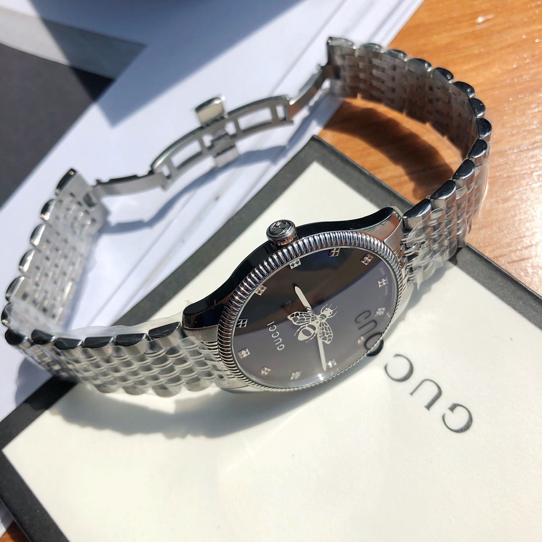 新款经典钢带款,属于G-Timeless系列,采用经典感性设计,融合太阳射线纹理表盘,以及巧妙设计的蜜蜂图案秒针;