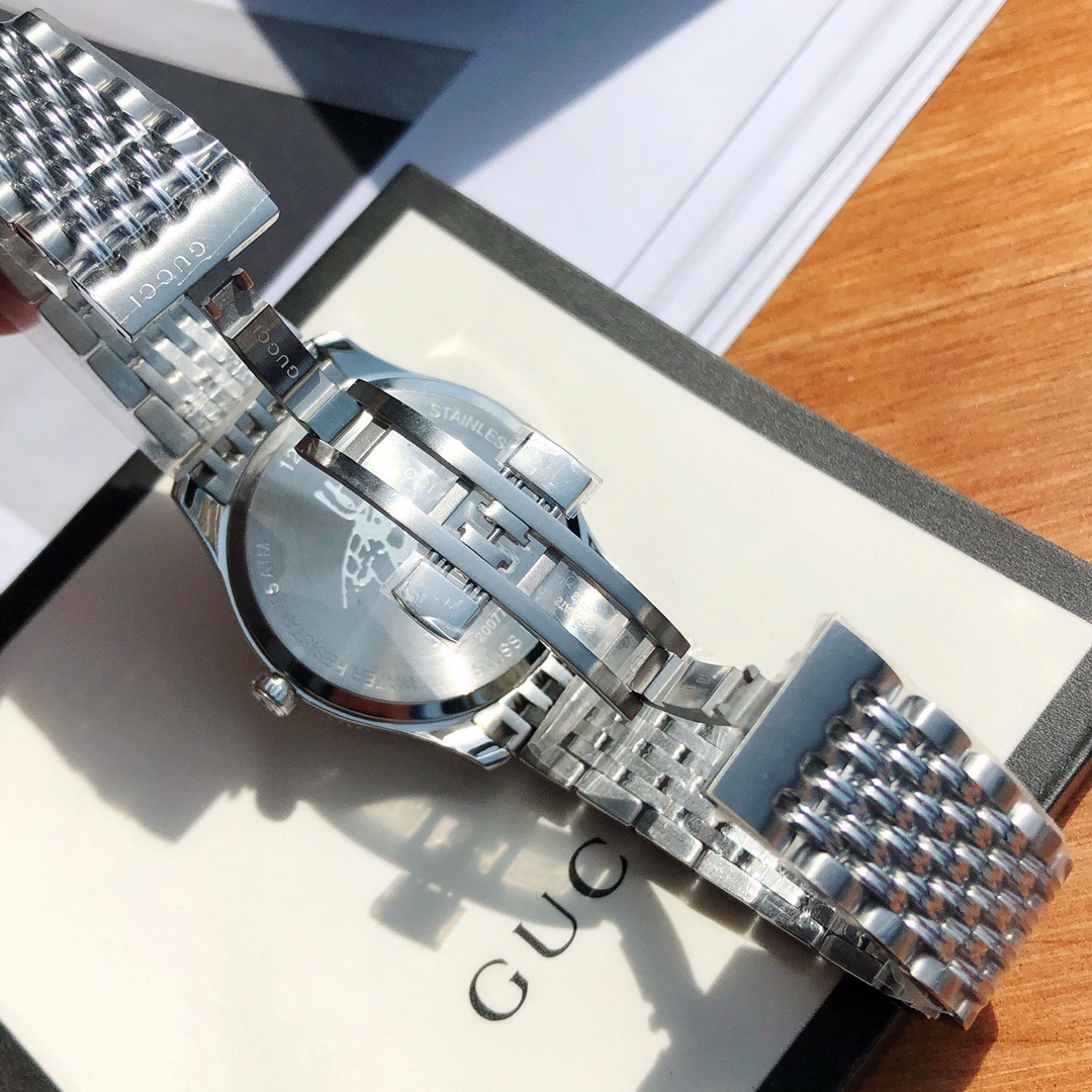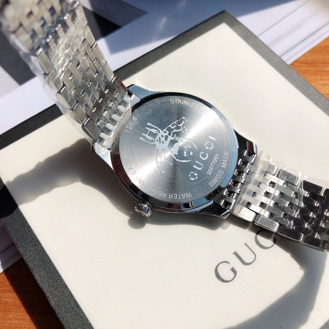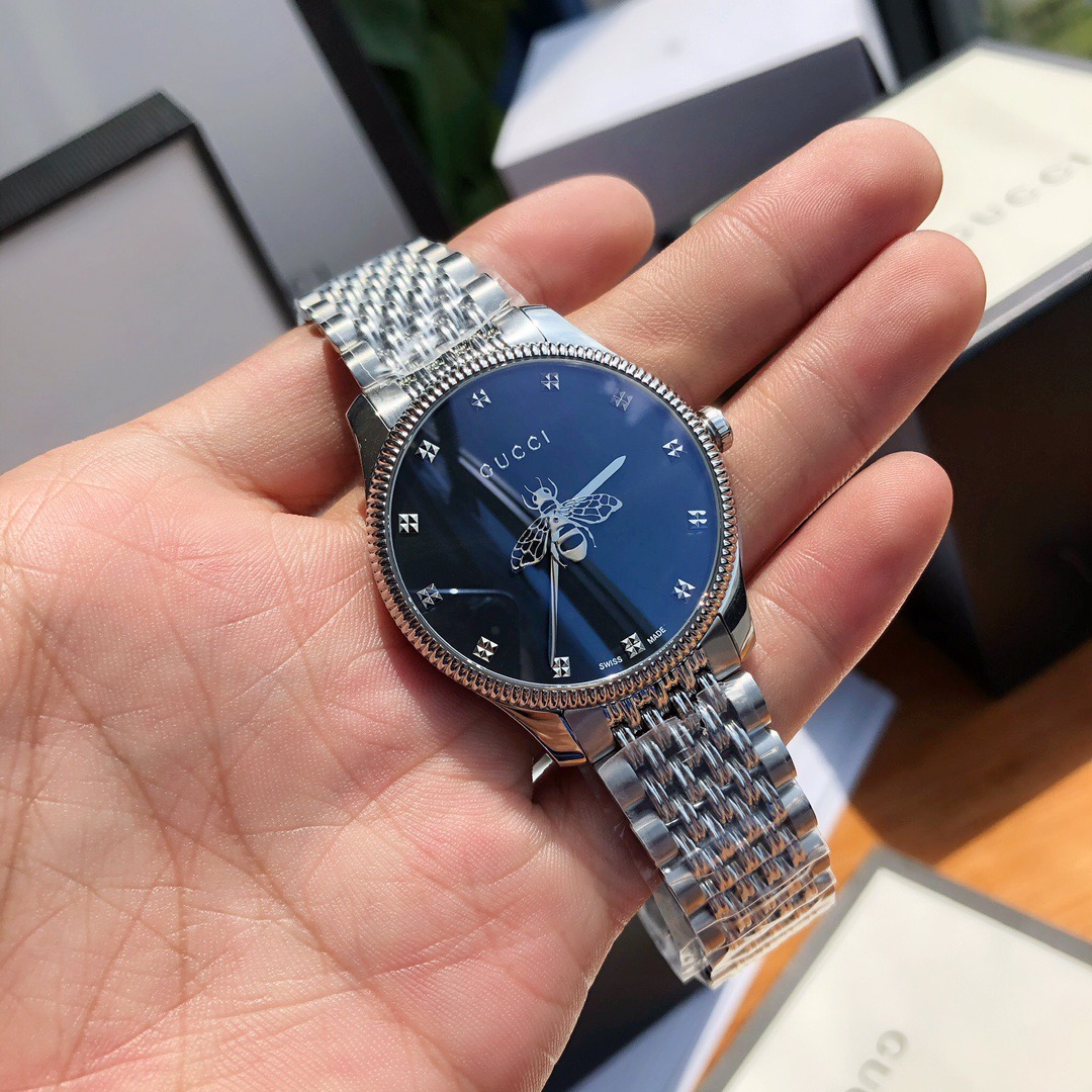新款经典钢带款,属于G-Timeless系列,采用经典感性设计,融合太阳射线纹理表盘,以及巧妙设计的蜜蜂图案秒针;