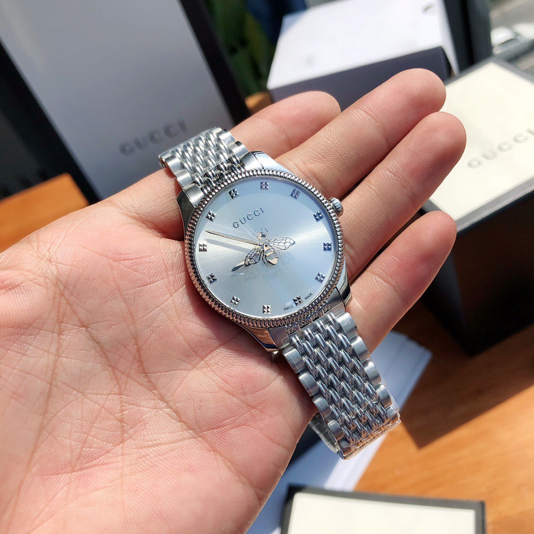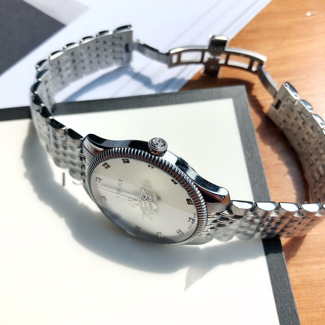 新款经典钢带款,属于G-Timeless系列,采用经典感性设计,融合太阳射线纹理表盘,以及巧妙设计的蜜蜂图案秒针;