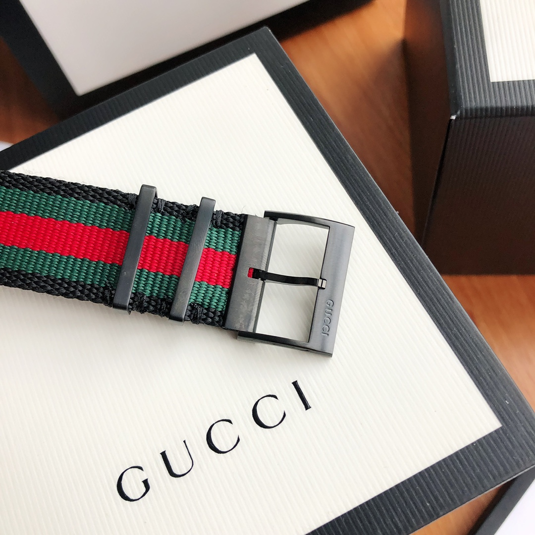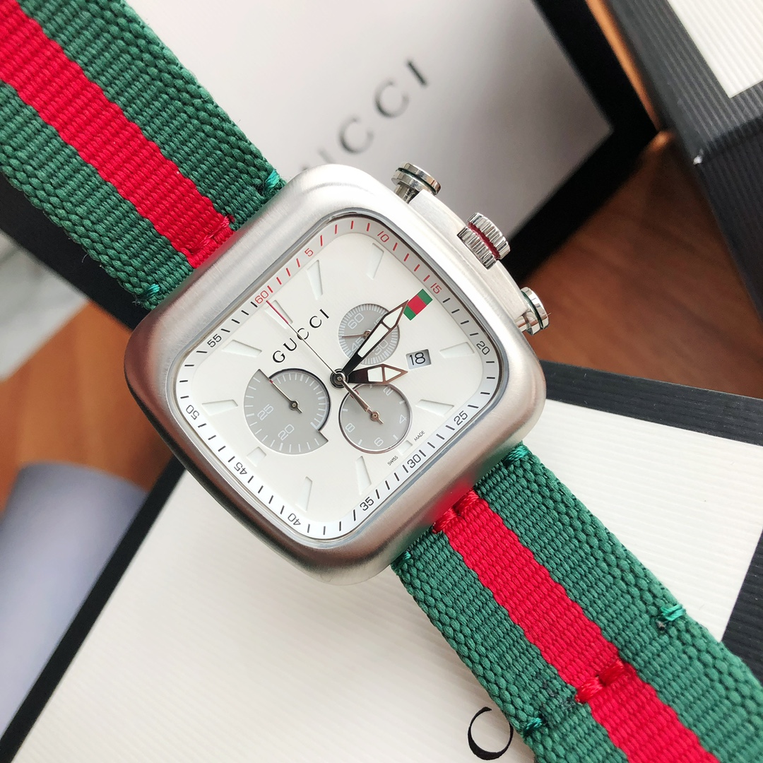 古驰Gucci石英男表,罕有的方形大表盘设计,搭配色彩鲜亮的布带,简直是男神们的吸睛法宝,六针多功能码表,蓝宝石玻璃,瑞士原装石英机芯,表径~44mm,带全套包装!