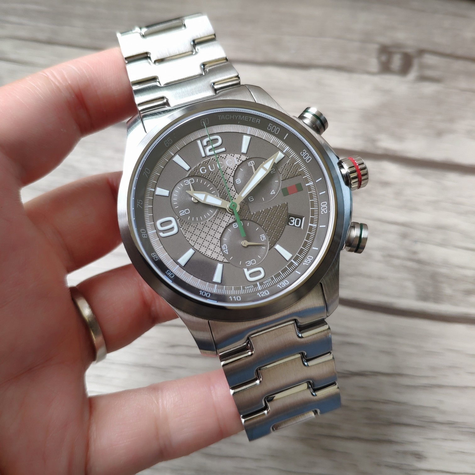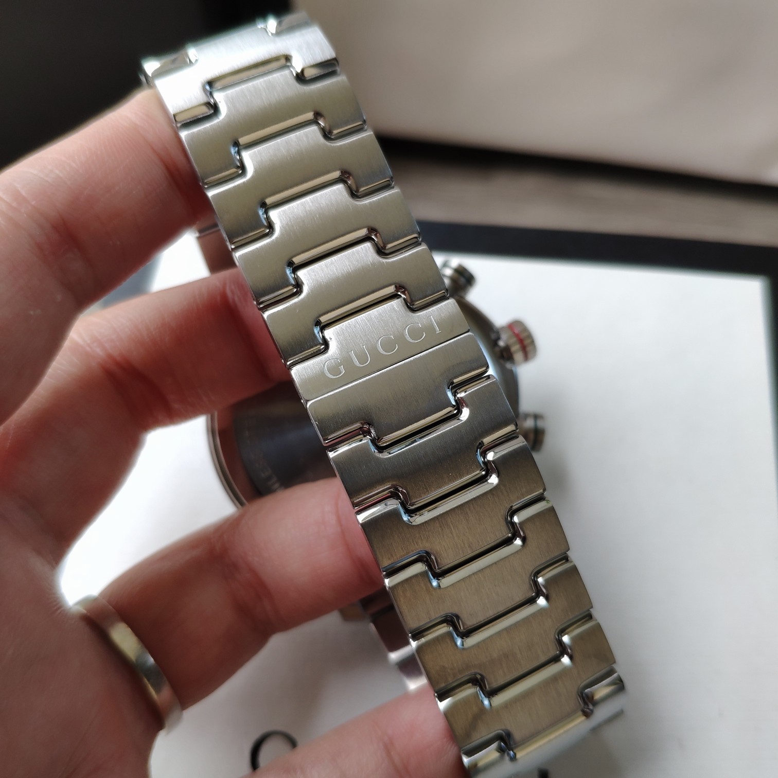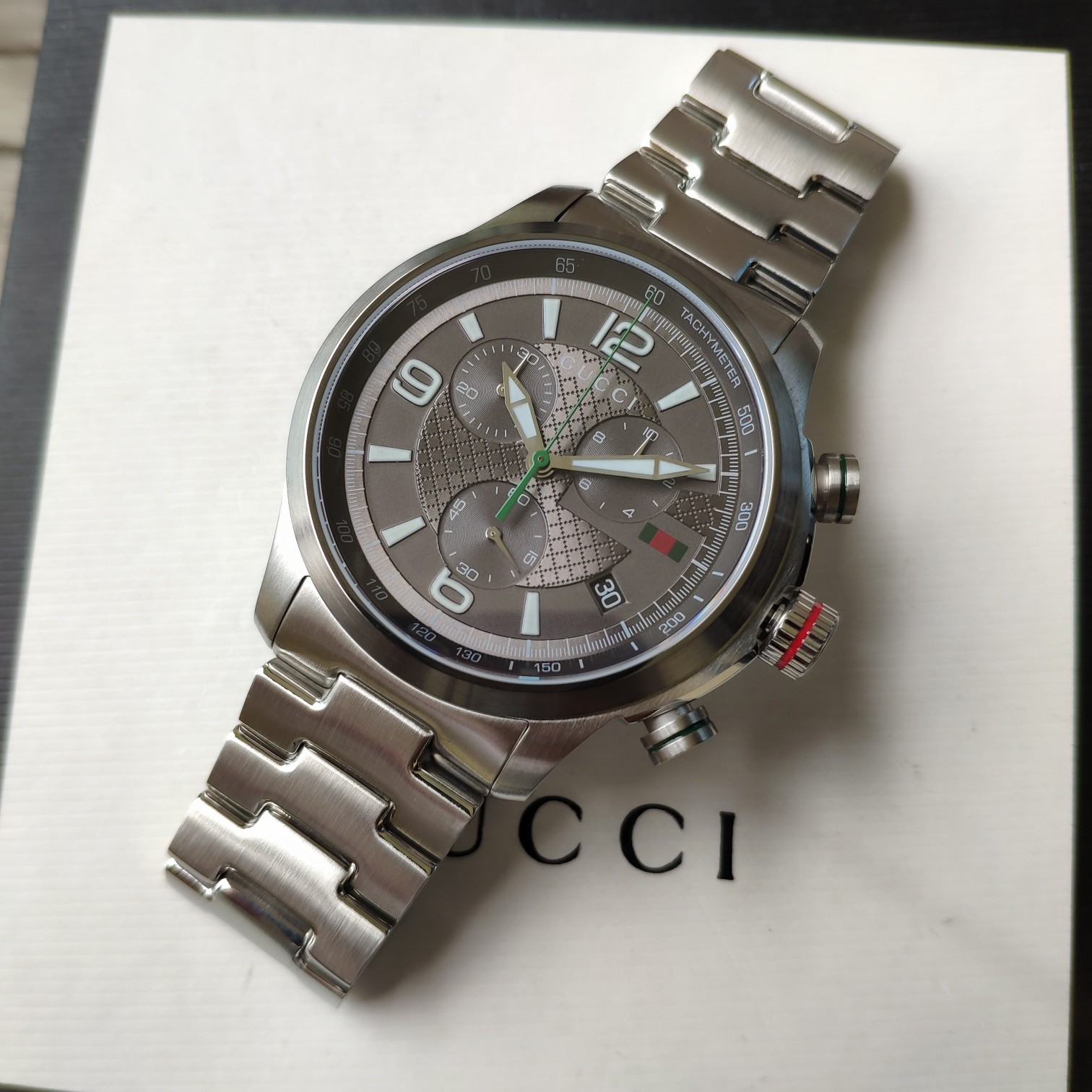 Gucci古驰原厂小蜜蜂六针石英男表,43mm,原装瑞士机芯,蓝宝石玻璃,316L精钢带,注意细节对比。防水50m,强力推荐,好货!全套包装!