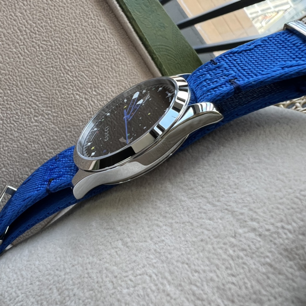Gucci G-TIMELESSGucci系列,中性表款,38mm表径,防眩目蓝宝石玻璃、316精钢表壳,双G刺绣尼龙表带,宇宙星空表盘设计,简洁大方,原装ETA机芯,全新全套出。