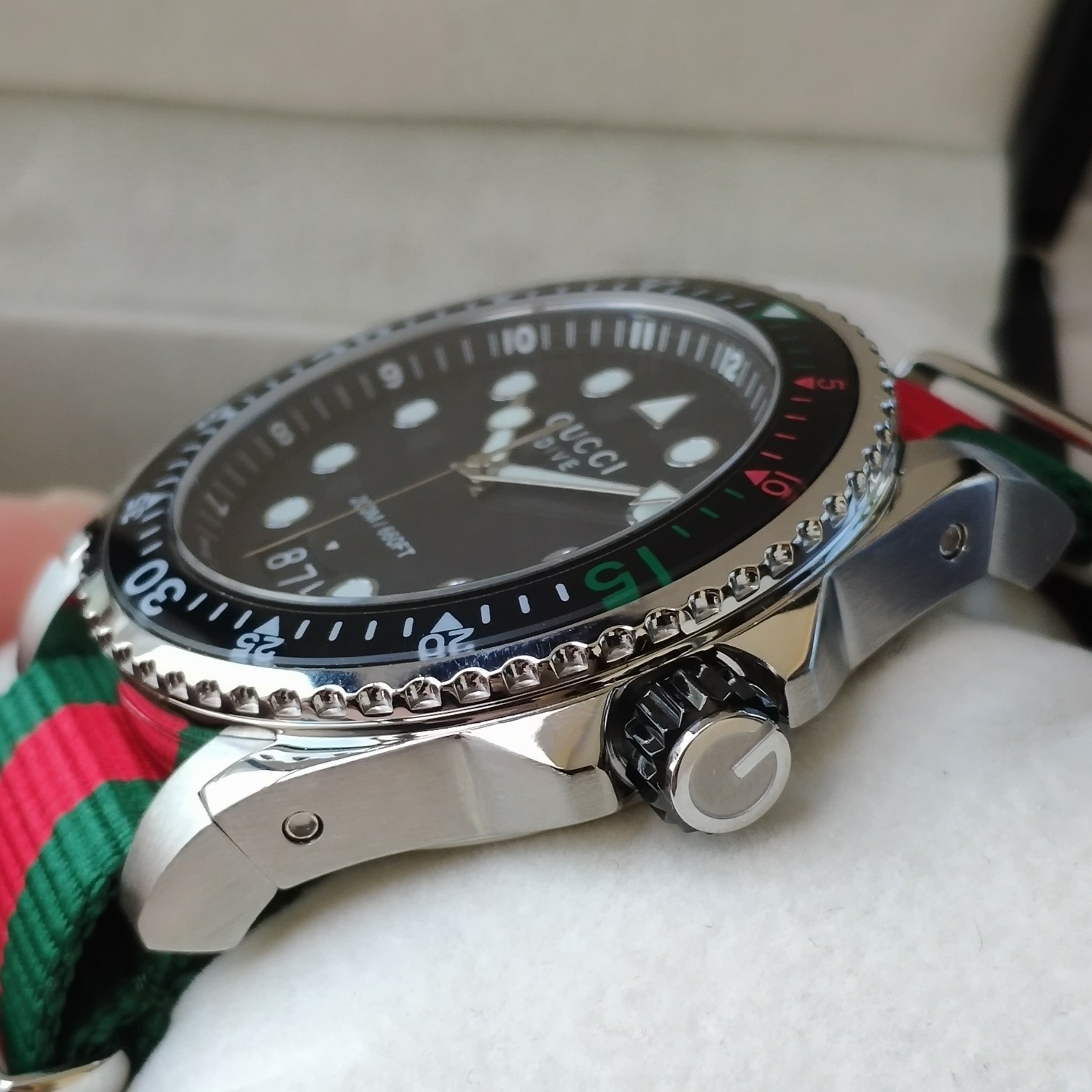 “GC65 古驰GUCCl水鬼最新款,蓝宝石玻璃,原装瑞士机芯,帆布表带,表径45mm!防水200m!” 的相关文章