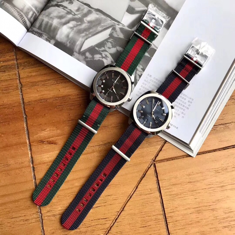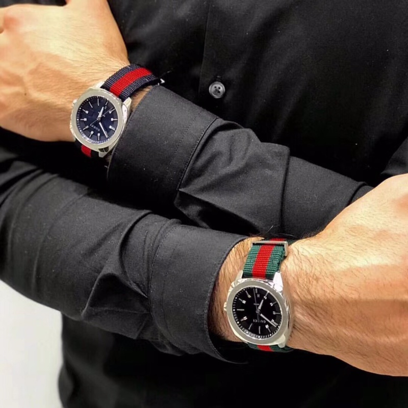 帅气十足的gucci男士石英腕表!原装进口机芯!蓝宝石玻璃表盘!配的是尼龙表带!上手非常休闲!出游必备的款式!表盘40mm!生活防水! 古驰布带款