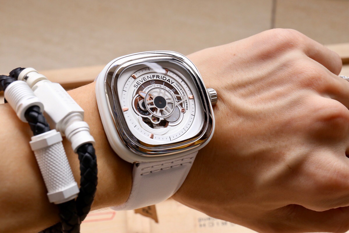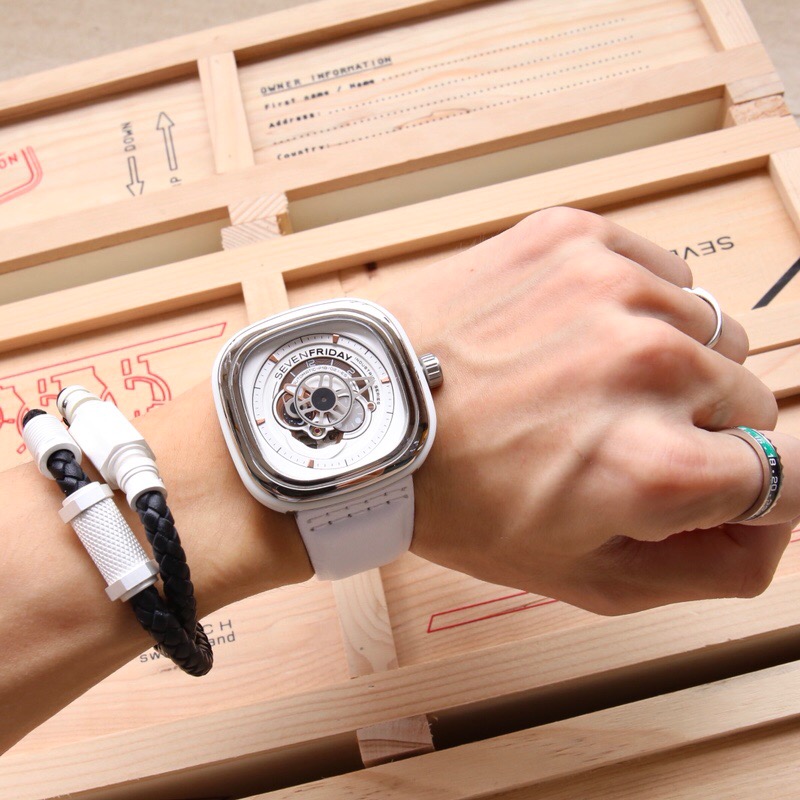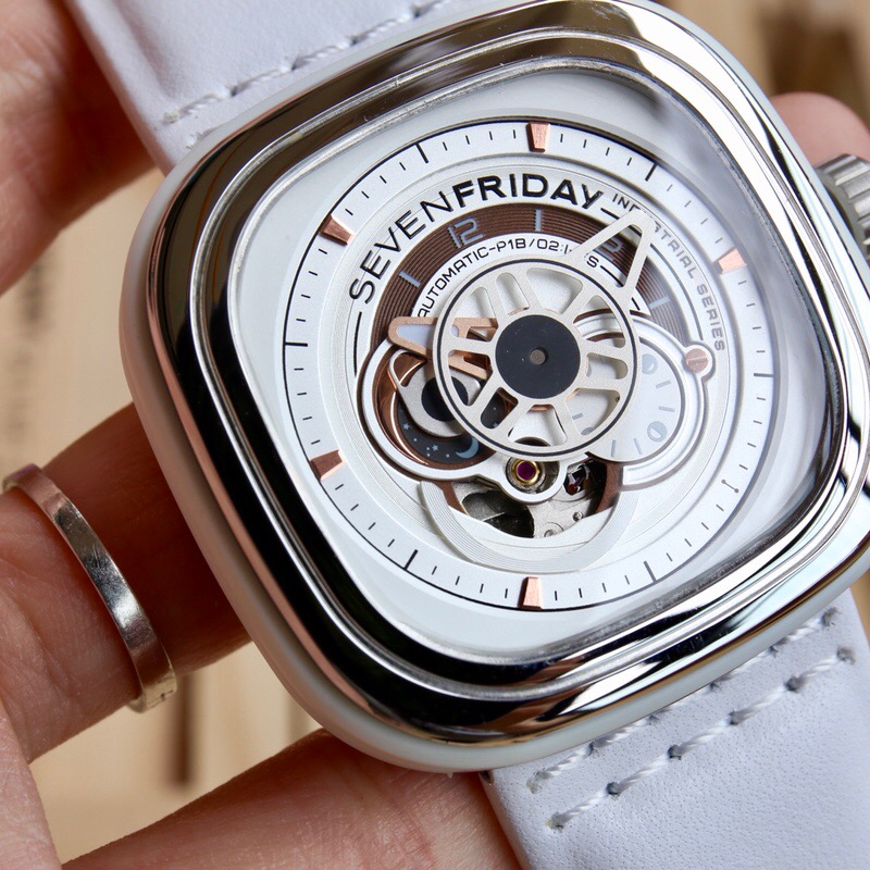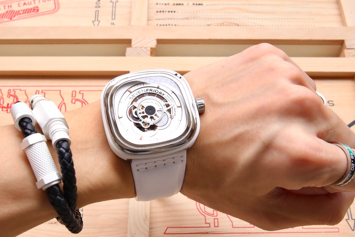 对于所有的SEVENFRIDAY P系列手表,机芯均为Miyota 82S7,其上为敞开式平衡轮,可提供40小时的动能储量;