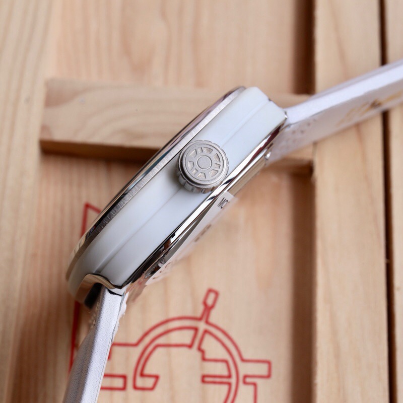 P1B/02型手表具有一个白色和金属铑色界面,由五层组成,表面依次呈现为无光泽处理、乳白色和具有5N金色强光效果的大理石切口处理;