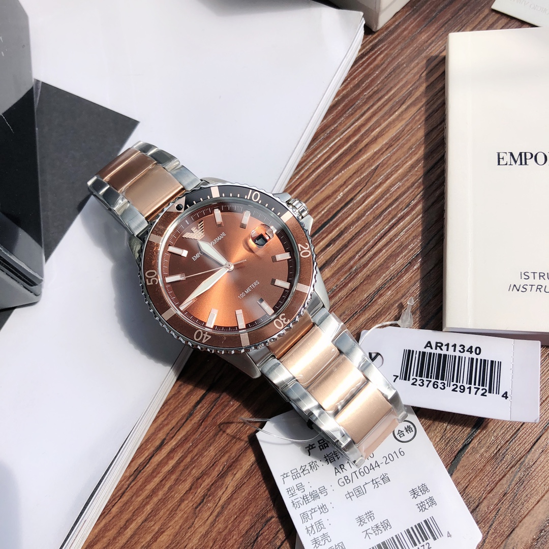 (Emporio Armani)阿玛尼2021新款商务休闲欧美简约大气石英钢带男士腕表 AR11340 潜水运动风 三针日历框 日晷纹表圈 金色表盘,彰显品质生活,精细抛光工艺打造,延续表身质感,细节处尽显品牌质感,不锈钢表带 镌刻鹰LOGO. 细节品质感,体现别具一格的生活 矿物质强化玻璃 100m生活防水 表盘直径42mm 表壳厚度12mm 配专柜全套包装;
