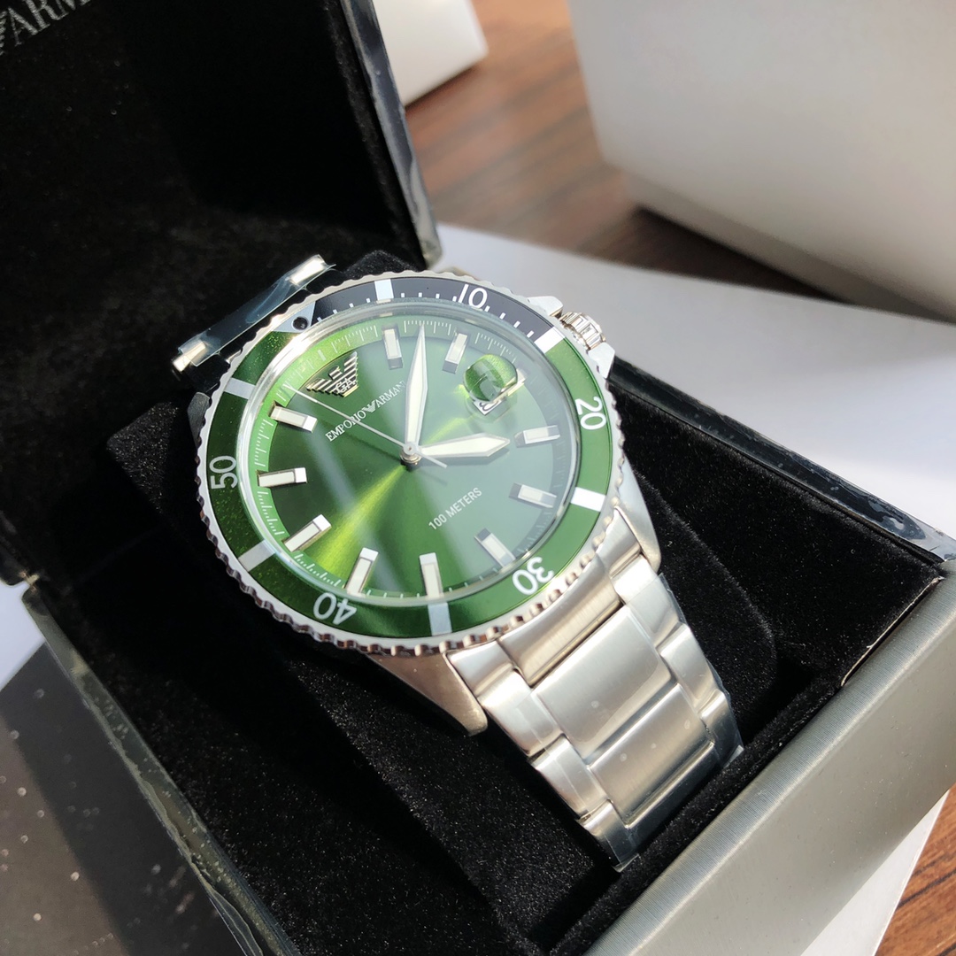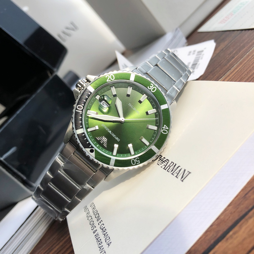 (Emporio Armani)阿玛尼2021新款商务休闲欧美简约大气石英钢带男士腕表 AR11338 潜水运动风 三针日历框 日晷纹表圈 绿色表盘,彰显品质生活,精细抛光工艺打造,延续表身质感,细节处尽显品牌质感,不锈钢表带 镌刻鹰LOGO. 细节品质感,体现别具一格的生活 矿物质强化玻璃 100m生活防水 表盘直径42mm 表壳厚度12mm 配专柜全套包装;