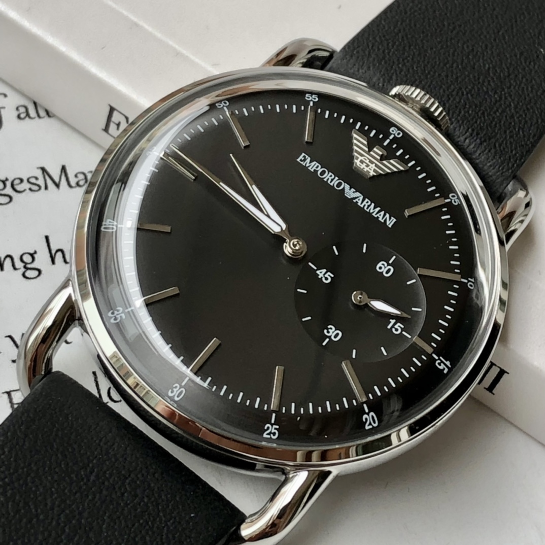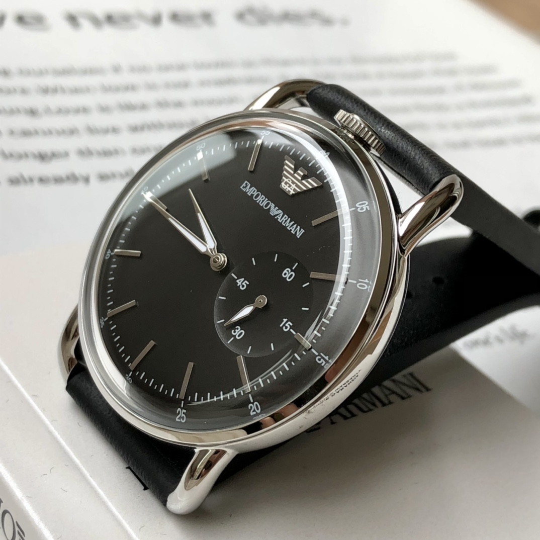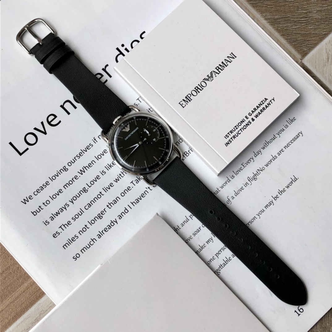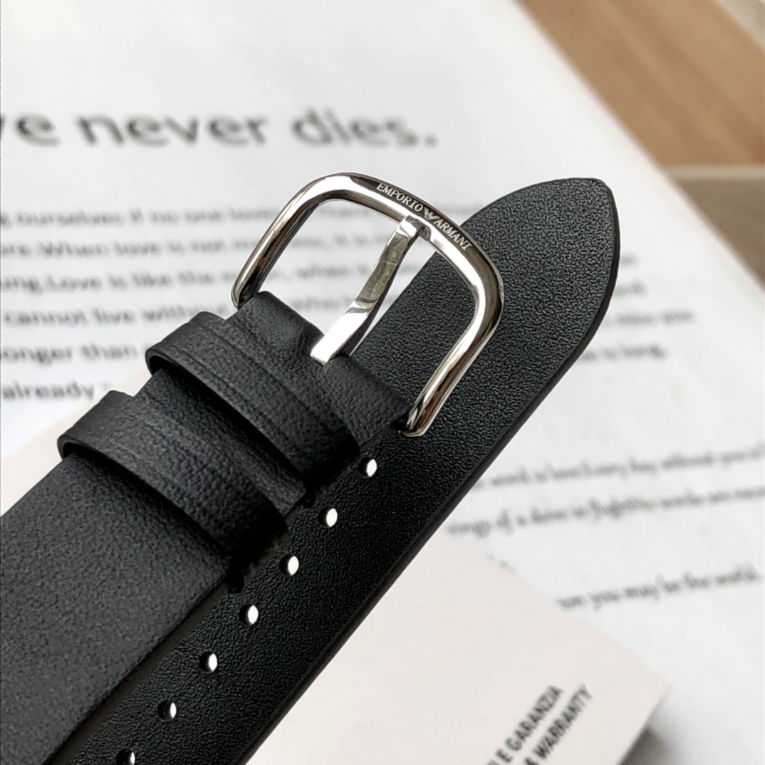 AR11336,深色简约表盘,低调而内敛,三点位多功能计时小表盘,别具匠心!表冠设置在12点钟方向,设计惊艳!超薄式表头,尽显儒雅,优质小牛皮表带给人成熟稳重的观感,触感柔软佩戴舒适!