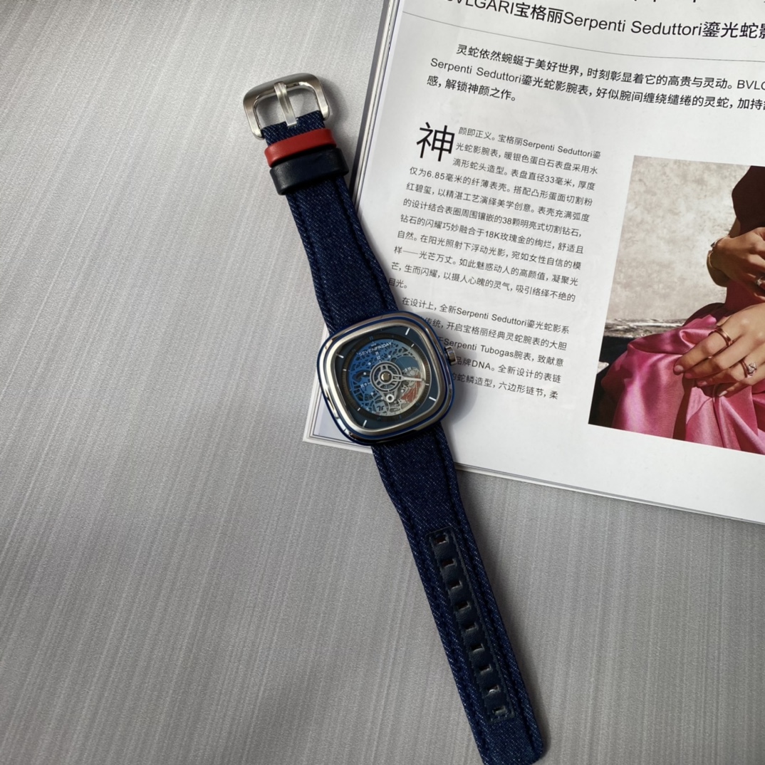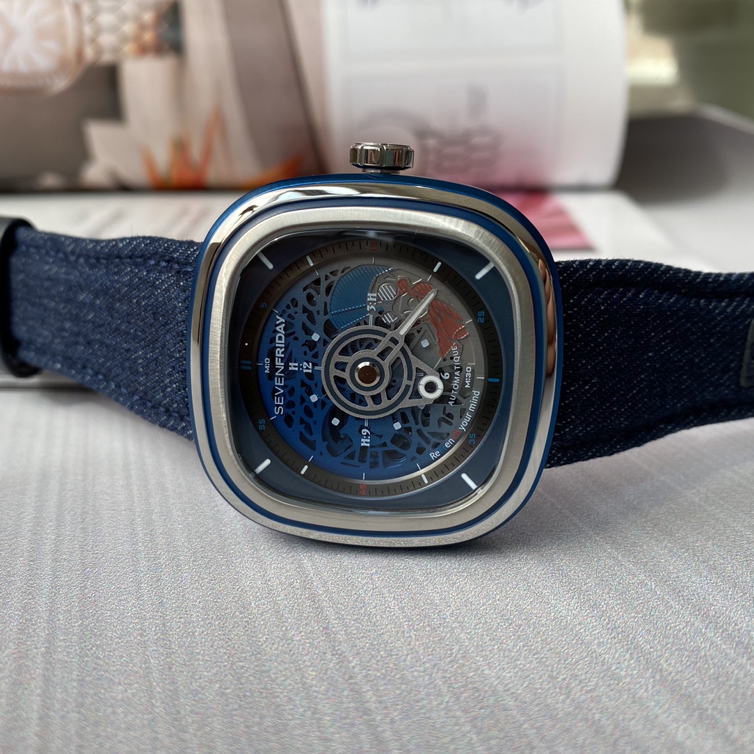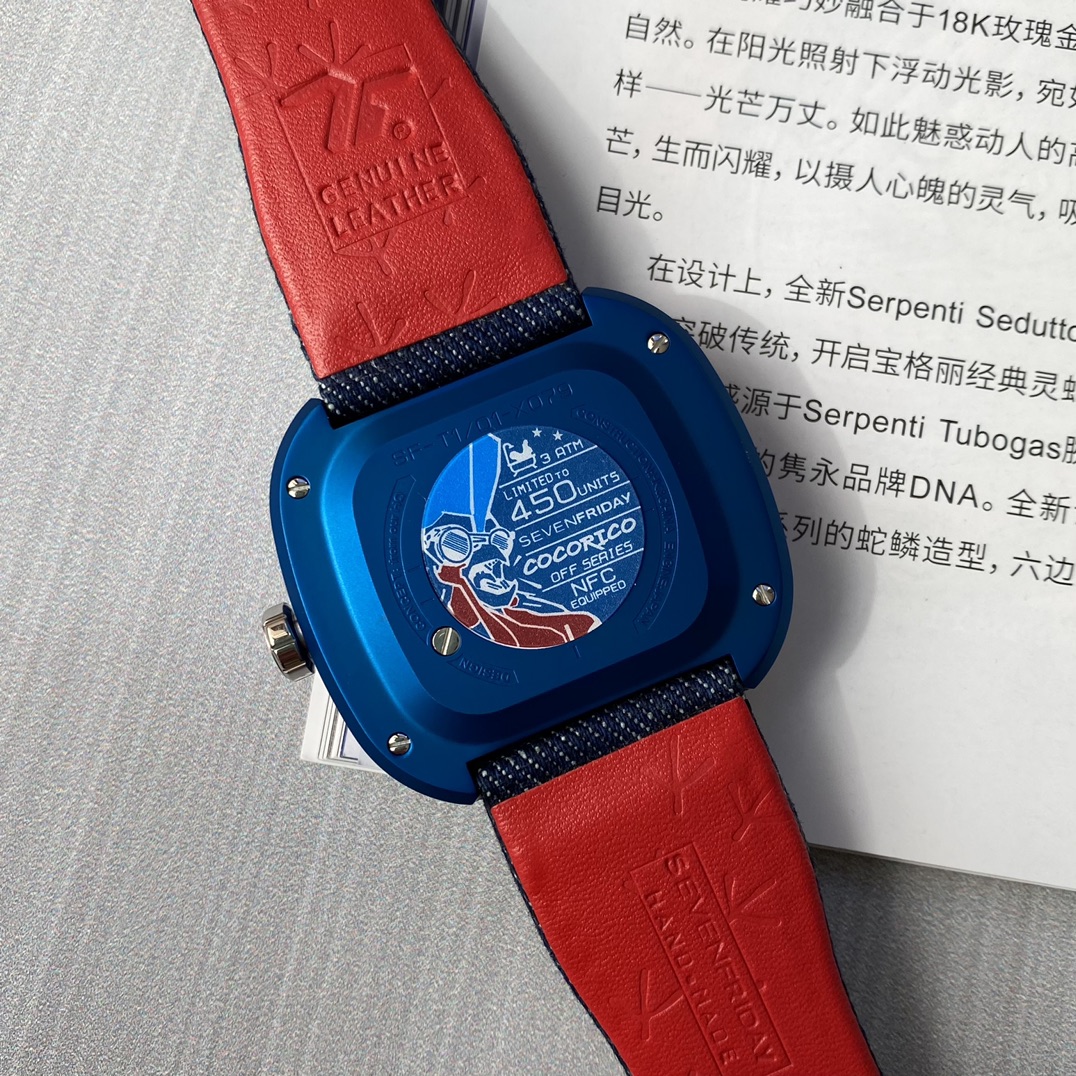 SEVENFRIDAY 七个星期五手表机械男表T1/01 ,改革后的新款比旧款更薄更轻,大小45.6x45.0mm 更符合国人手型 ,深蓝色316L精钢拉砂表壳 线条质感明显 ,30米防水 ,机芯方面搭载日本镂空全自动机械机芯NH70 ,此机芯有40小时动能储存 ,K1强化矿物质玻璃 ,多层面渐兰色半透明表盘设计 ,白色和黑色印刷读数 ,指针带夜光涂层 深蓝色丹宁材质加同色绣线 ,真皮红色内衬表带 ,特殊公鸡脚印压花,佩戴舒适耐用 ,表背配有NFC芯片用于检验 ,配上全套专柜新款包装。