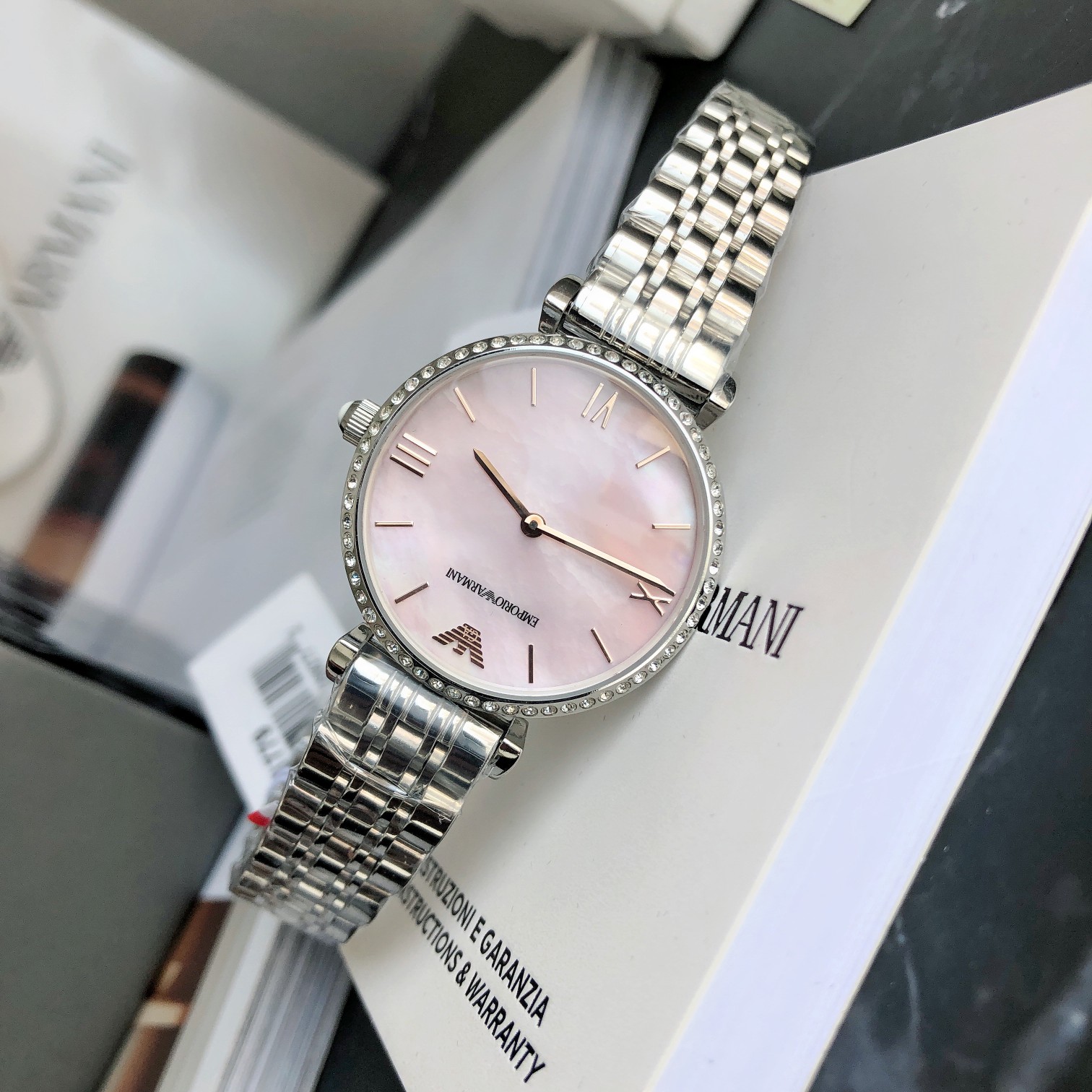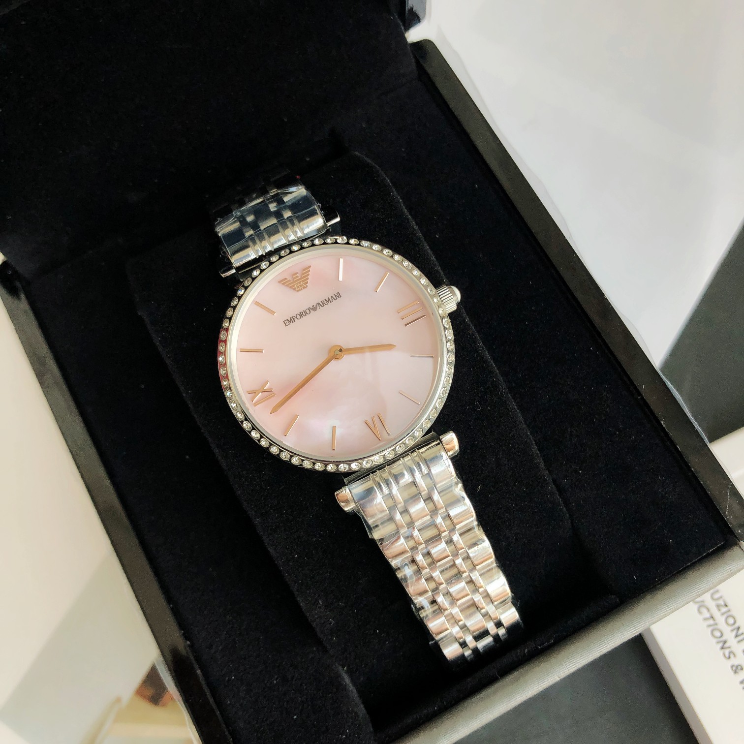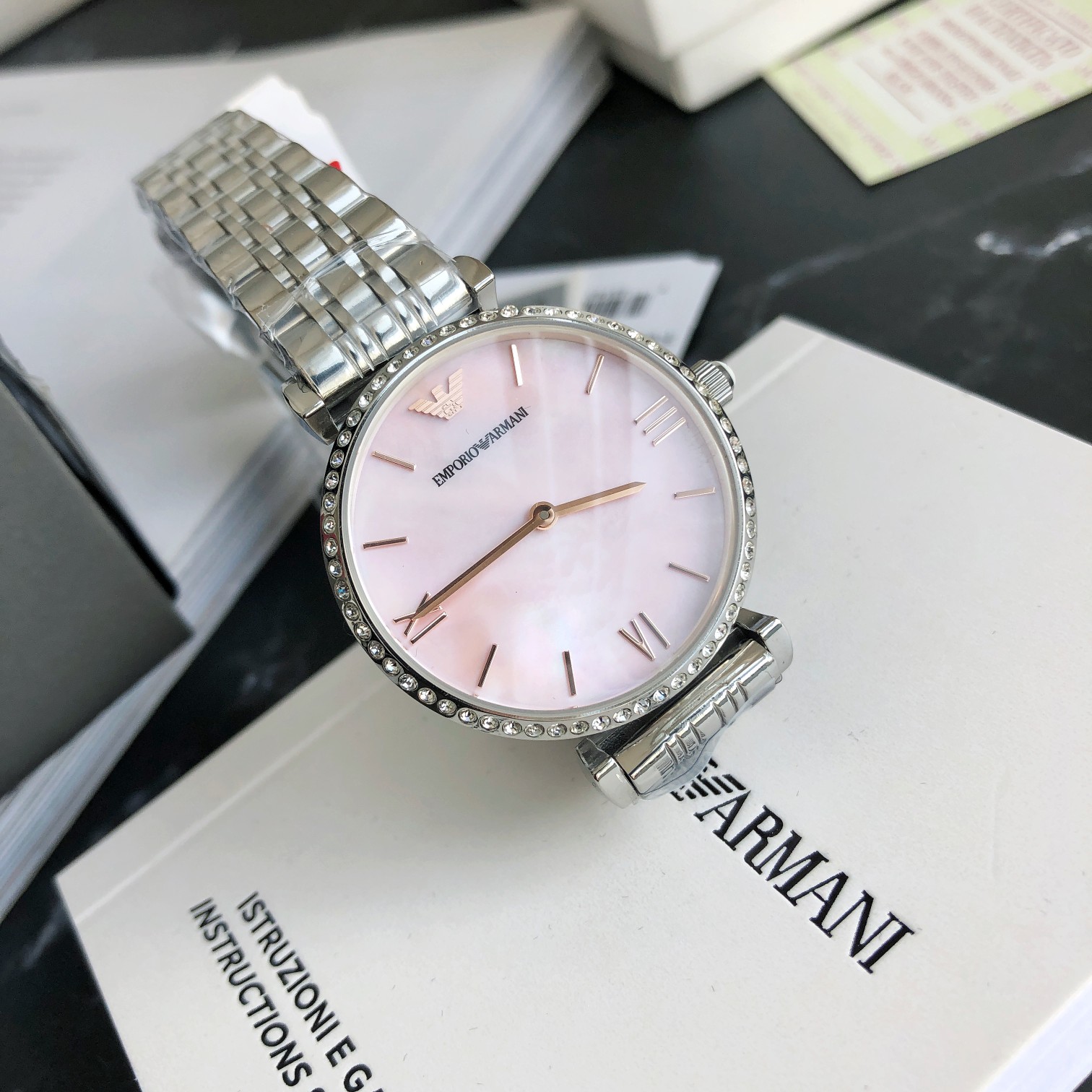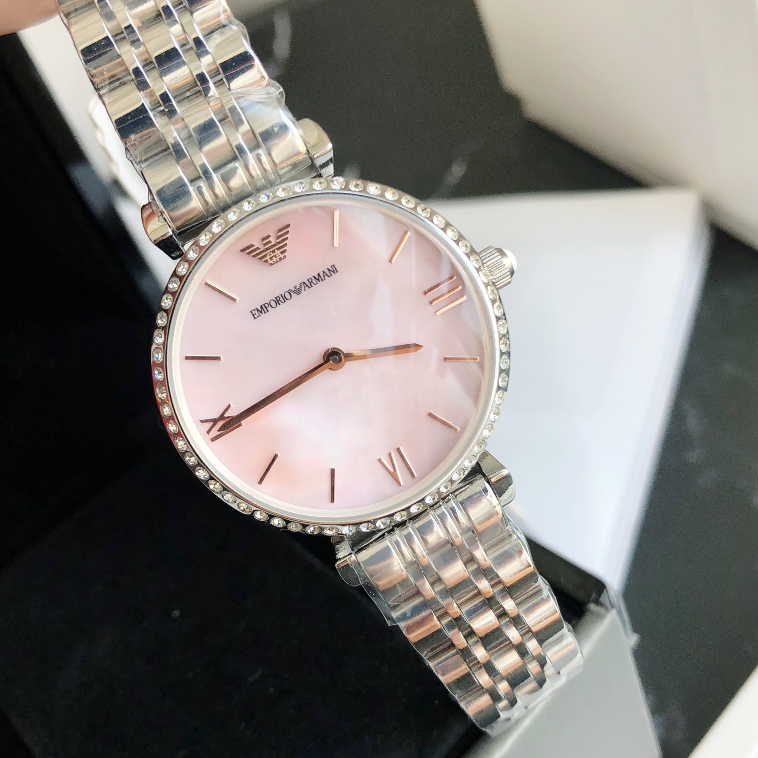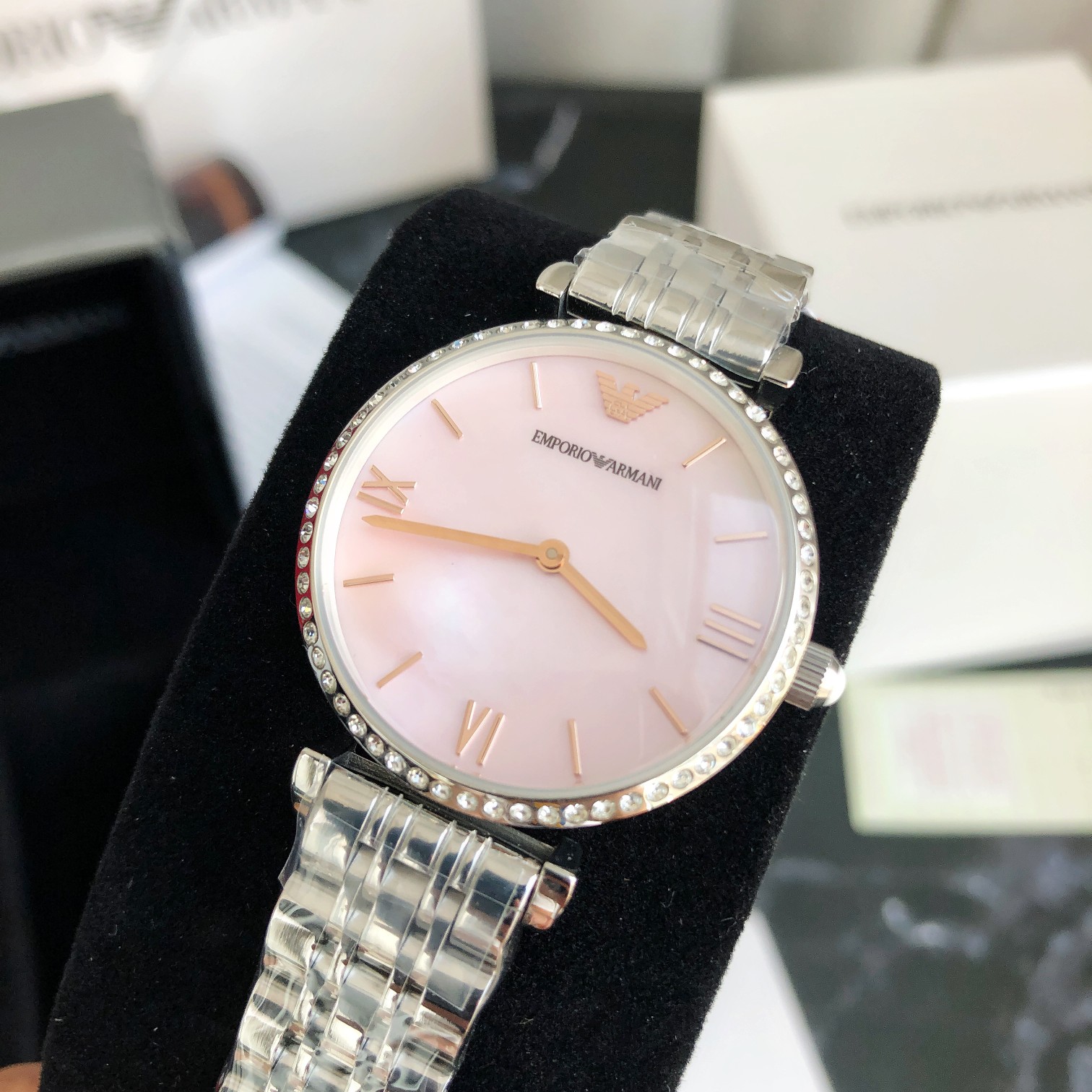 “AR1779 阿玛尼女款石英手表;型号AR1779,表盘32mm;两针洁简款,贝母粉色字面,表盘围周镶嵌” 的相关文章