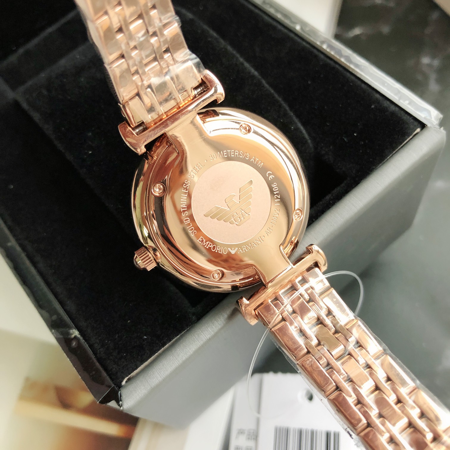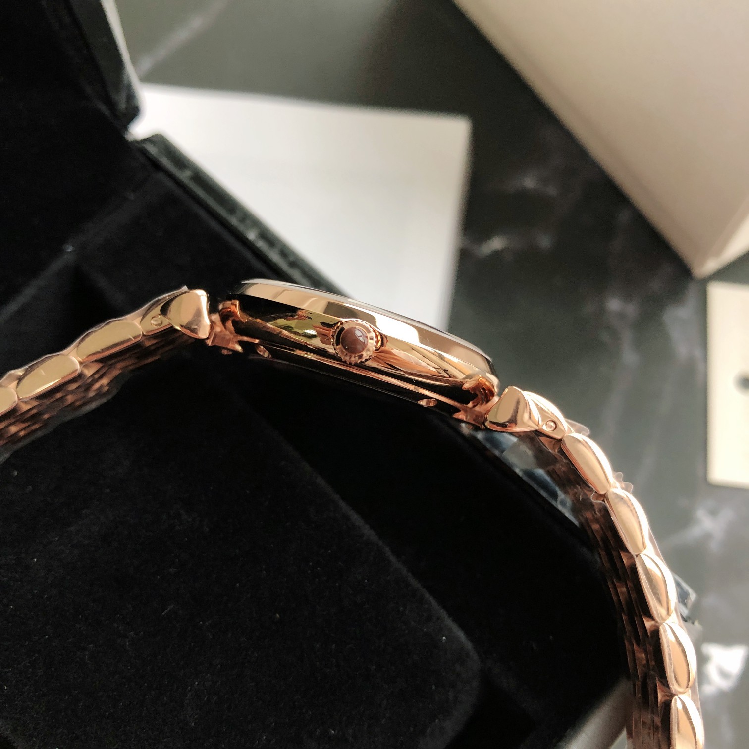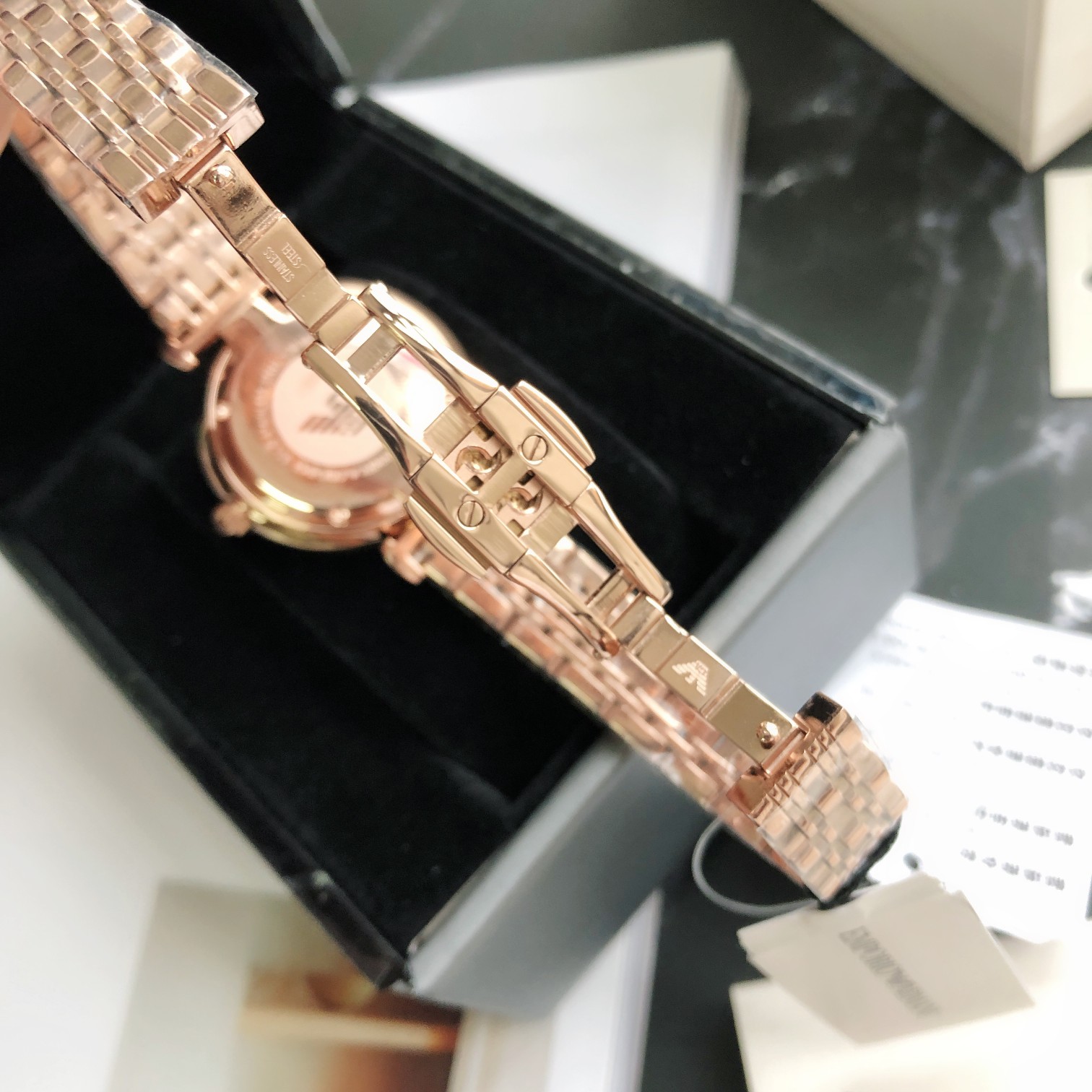 黑色满天星表盘 金属指针,细节彰显质感,圆形表冠搭配黑色满天星表盘尽显优雅气质,玫瑰金色表带,典雅质感,搭配蝴蝶扣方便摘戴;