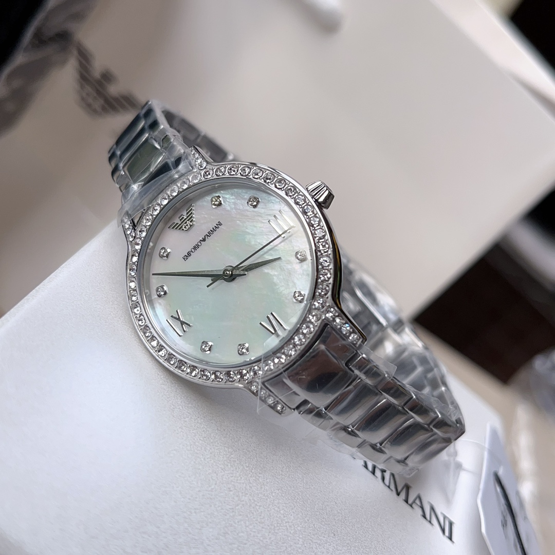 阿玛尼ARMANI女表,尺寸:32mm,是女生就永远抵挡不住圈钻的诱惑,带上手腕的一刻,眼神就半秒都不想离开,贝母盘永远的天花板,天空之镜,心向往之。