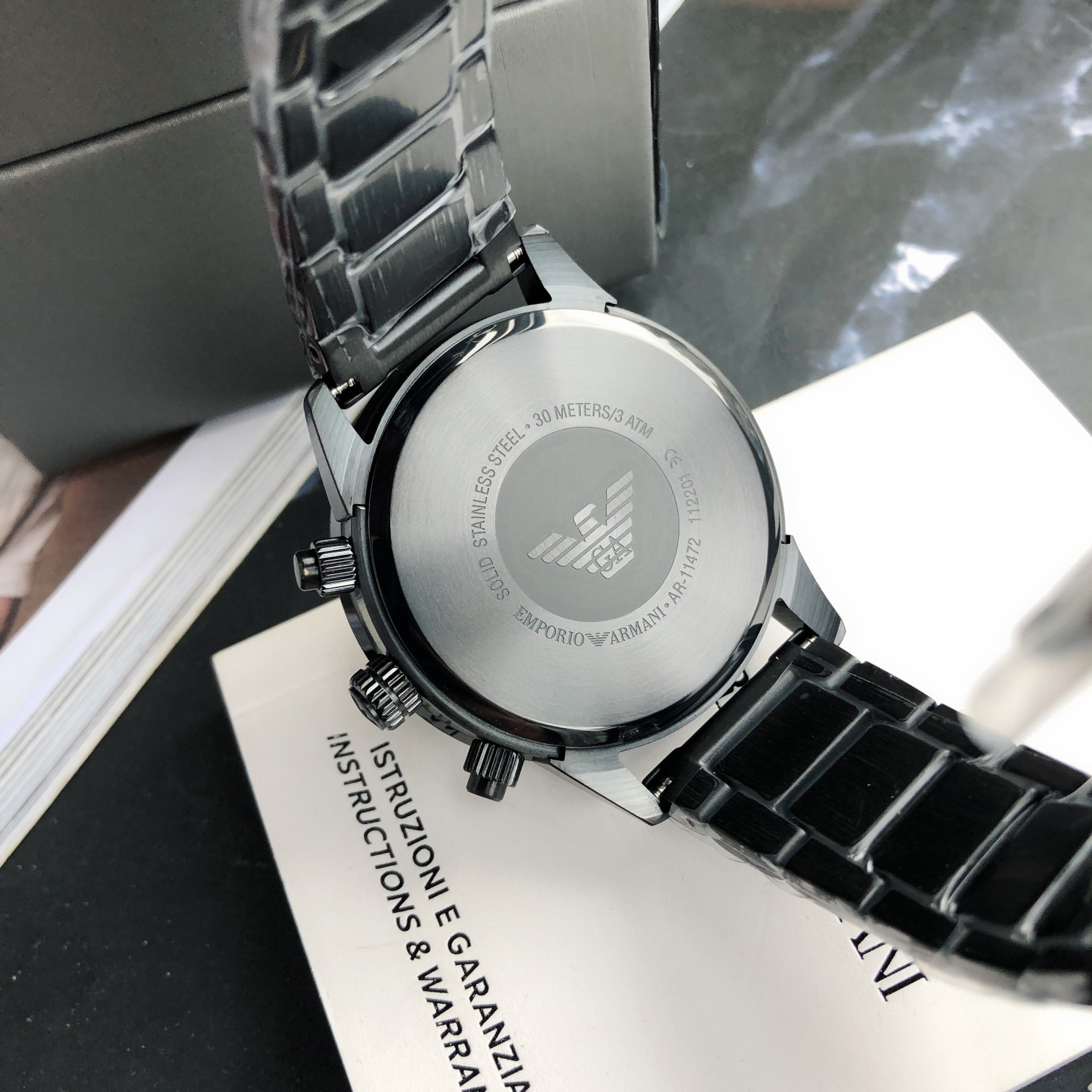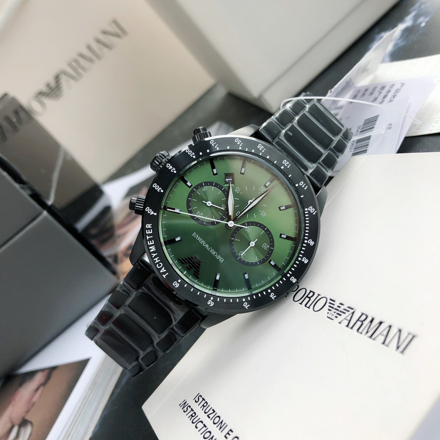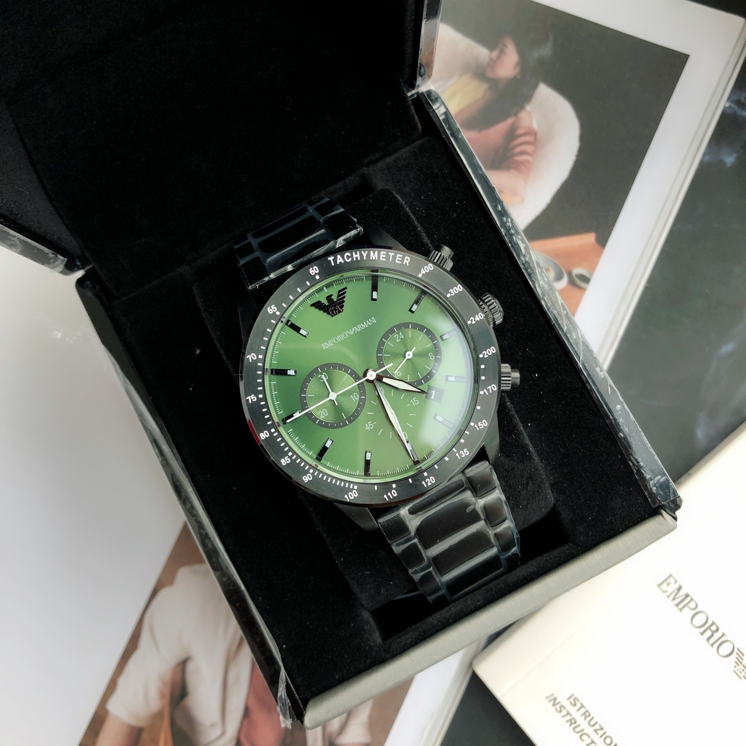 AR11472 新款商务休闲欧美简约大气石英钢带男士腕表,潜水运动风 三针日历框,日晷纹表圈 绿色表盘,彰