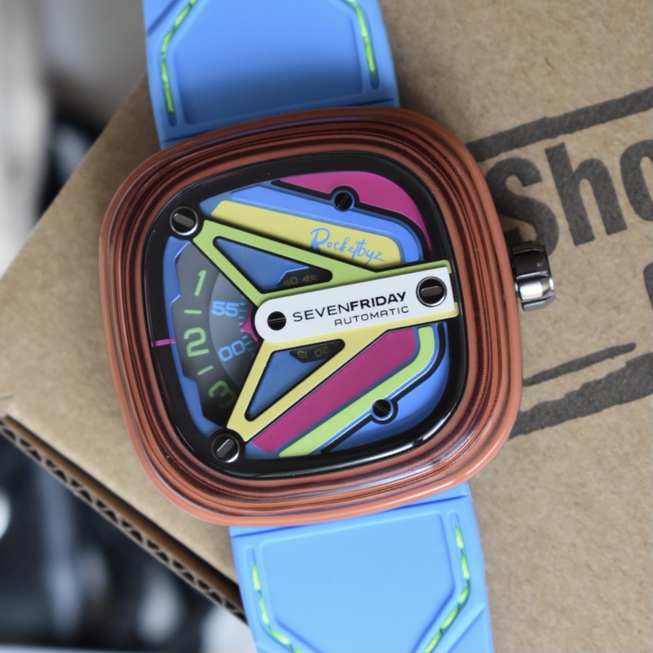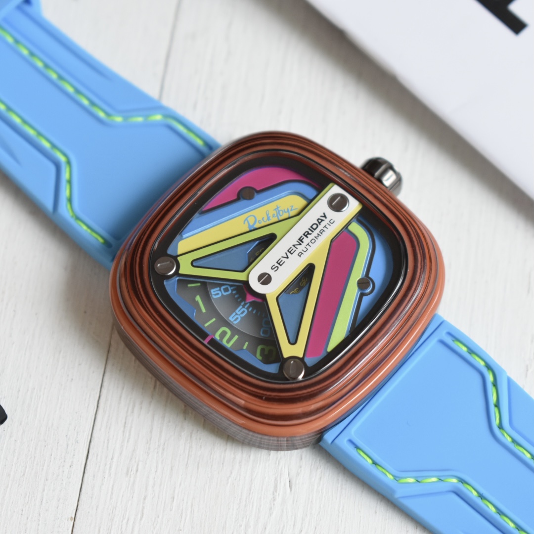 sevenFriday携手Rocketbyz工作室打造的2020年最新第二代联名款SF-M3,将地下文化中纷繁浓郁的荧光色彩元素融入腕表中,整表有由表壳,表圈,表壳动态环,锁螺丝底盖组合而成,整个表盘用色彩来表达自我,绝对的个性潮人必备,男女都合适佩戴 ,30米防水防 ,支持NFC验证 ,原装正品西铁城自动机械机芯8215 40小时的动能存储,配原厂全套包装。