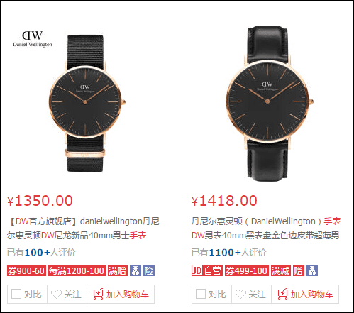 从截图上可以看到,基本上京东商城上DW手表自营店的售价跟官网售价统一,大多都在一千元以上。